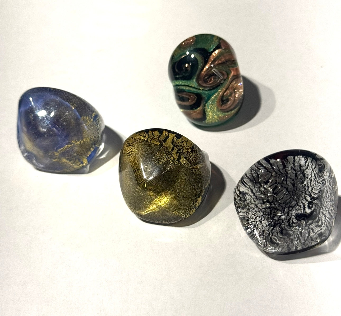 Anillo de goma con pieza bañada oro o plata (según la variante seleccionada).
