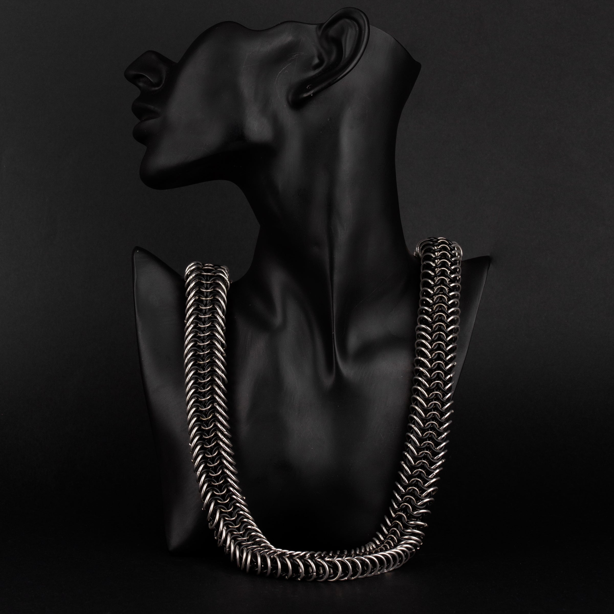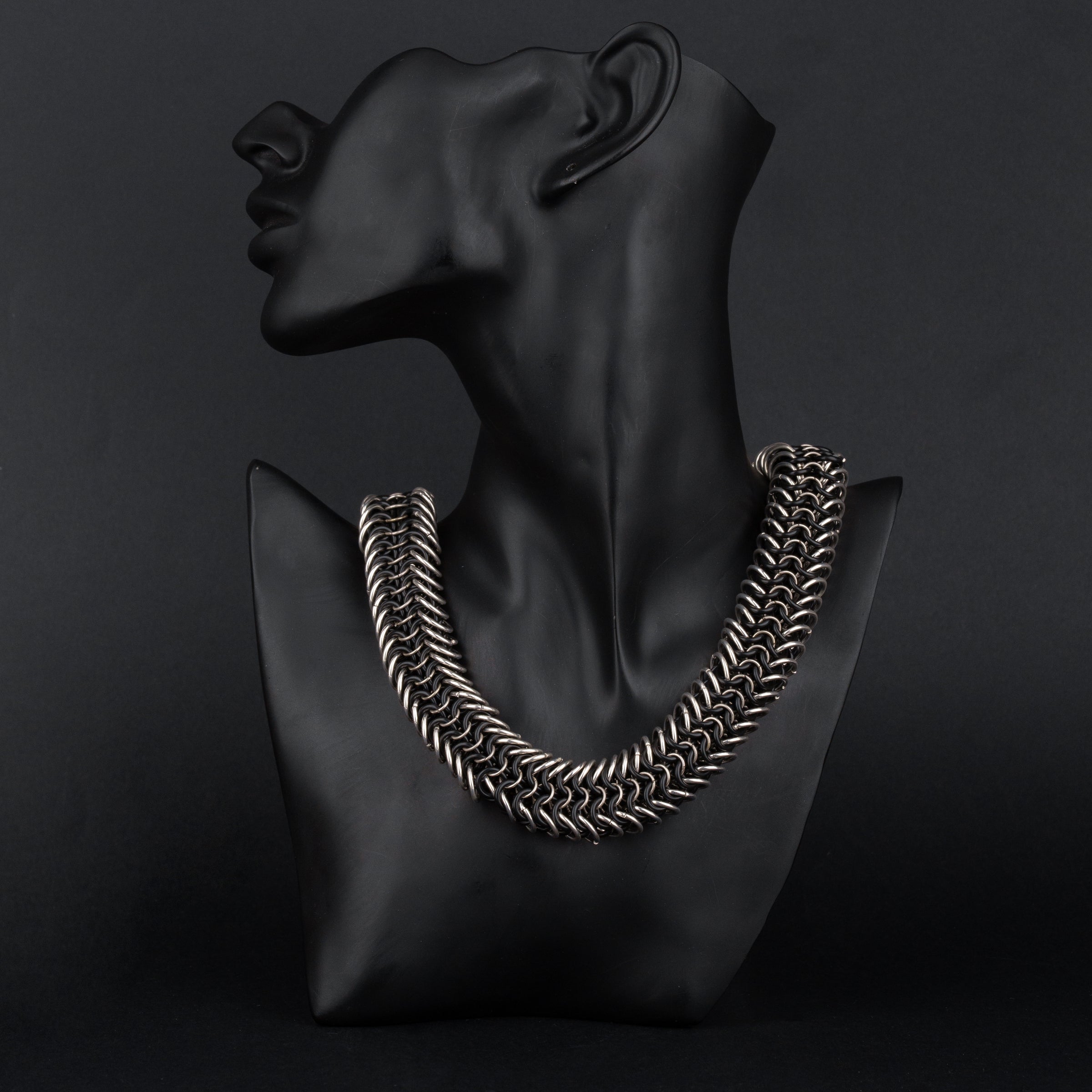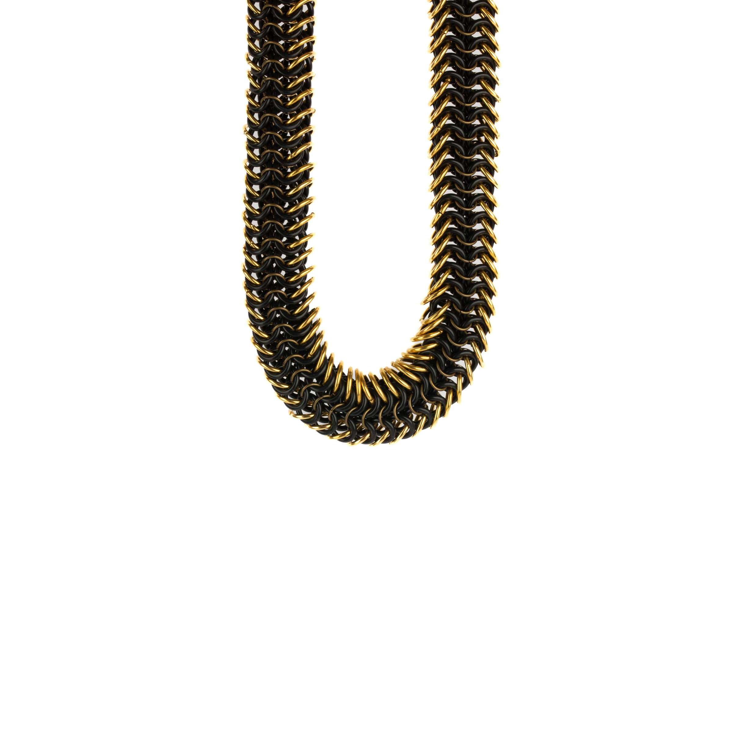 Collar de malla elástica, entrelazada a mano con anillas bañadas en oro o plata, combinadas con gomas de caucho.