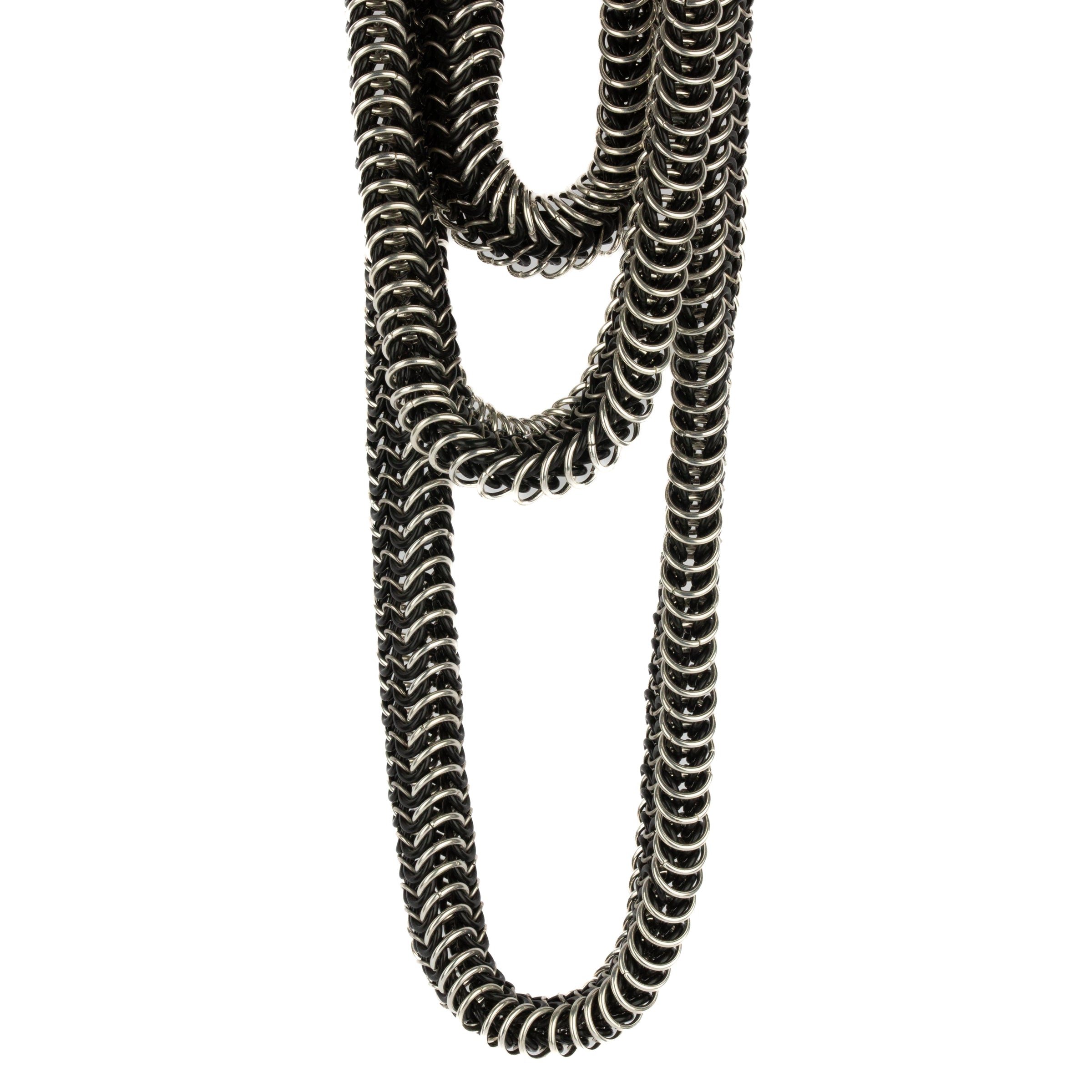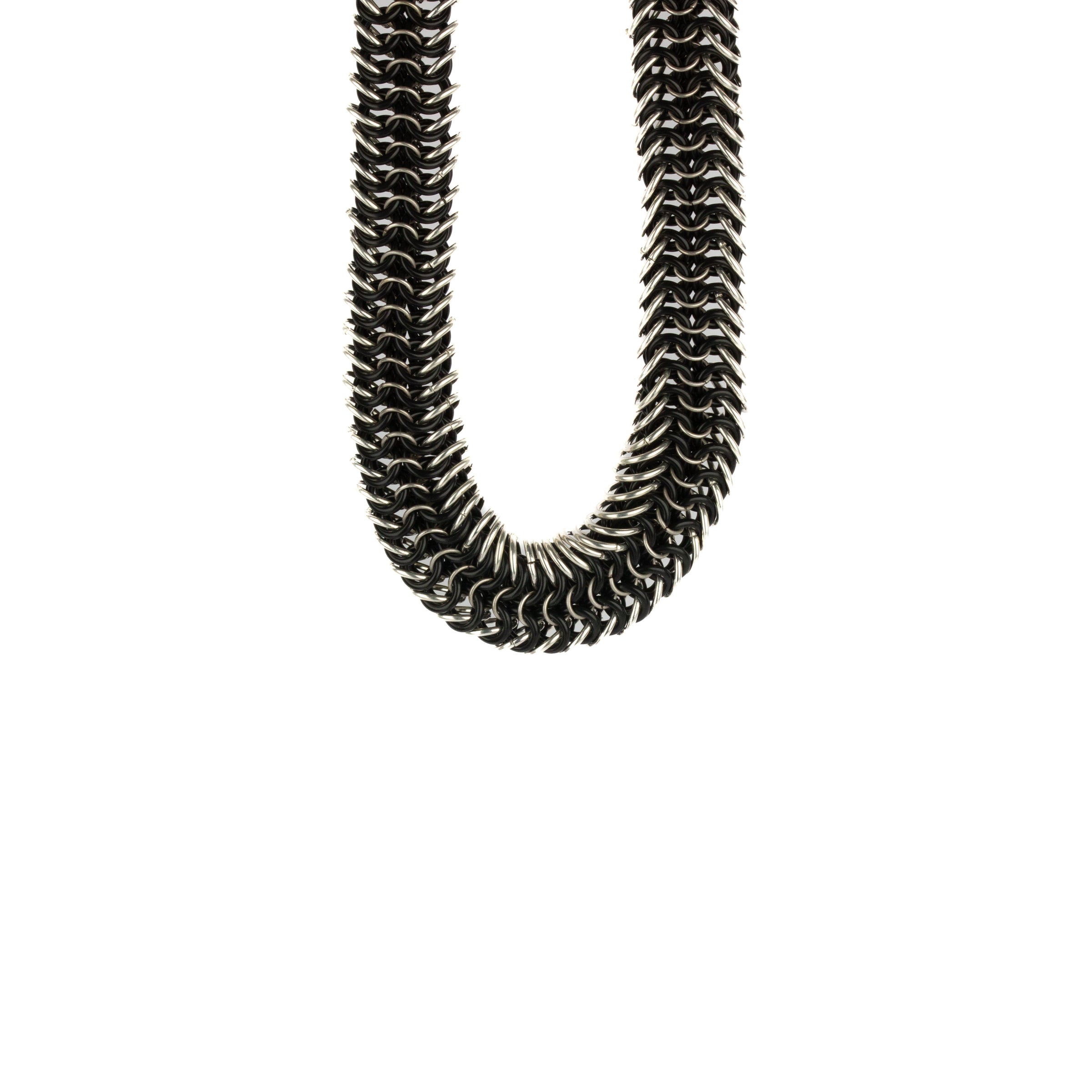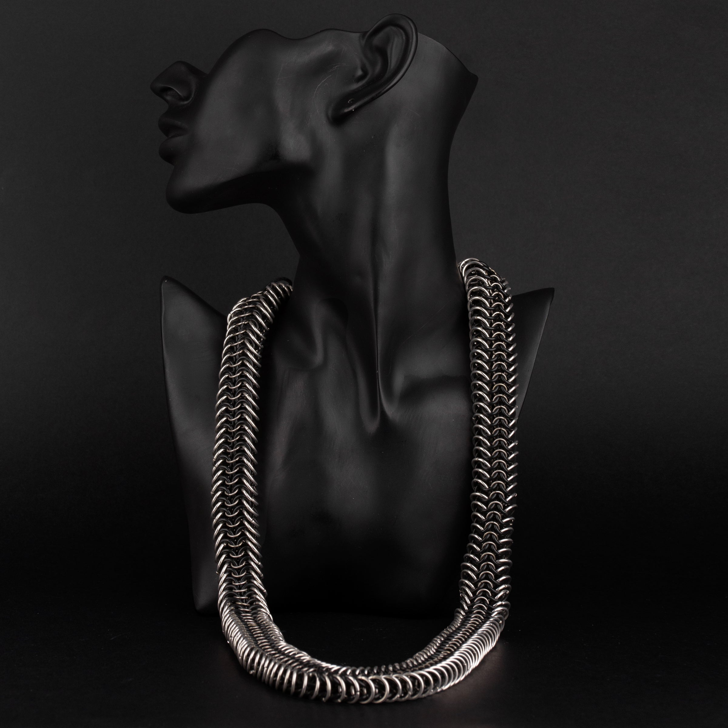 Collar de malla elástica, entrelazada a mano con anillas bañadas en oro o plata, combinadas con gomas de caucho.