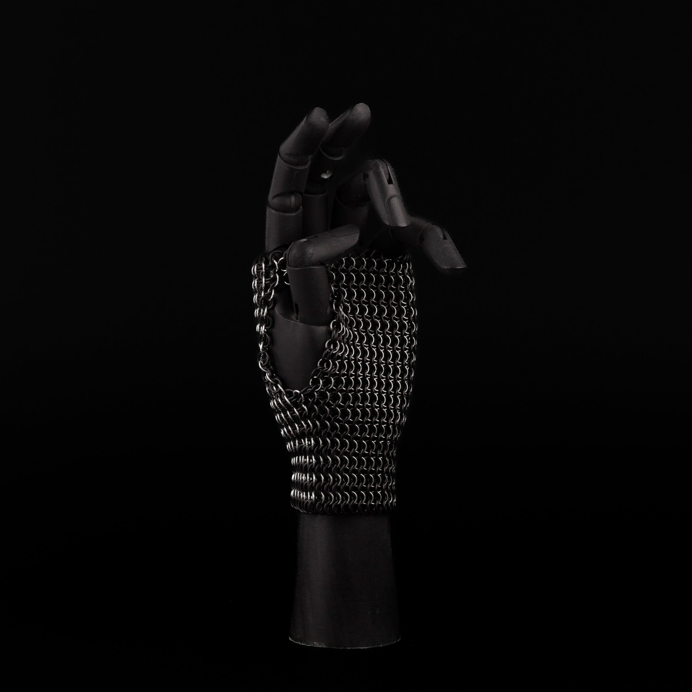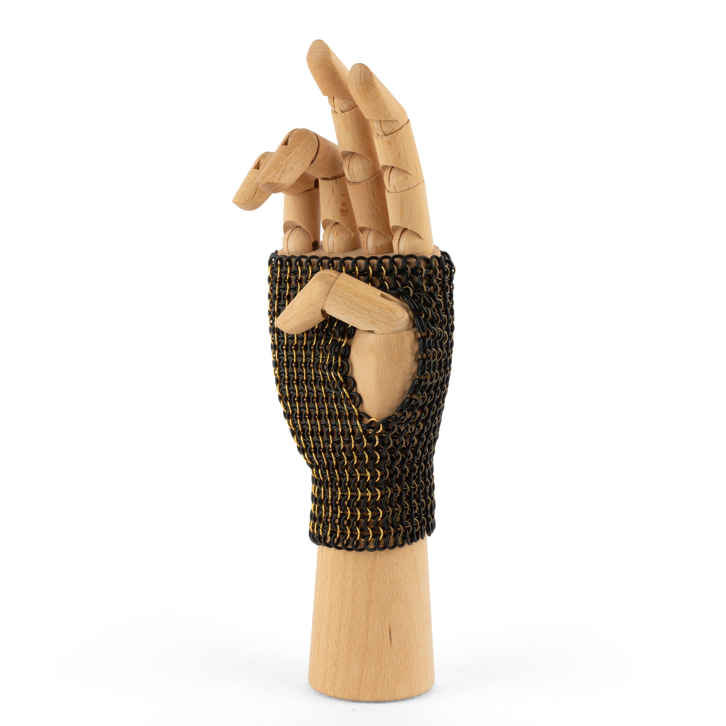 Elastic mesh glove, hand-woven with gold or silver plated rings, combined with rubber bands.