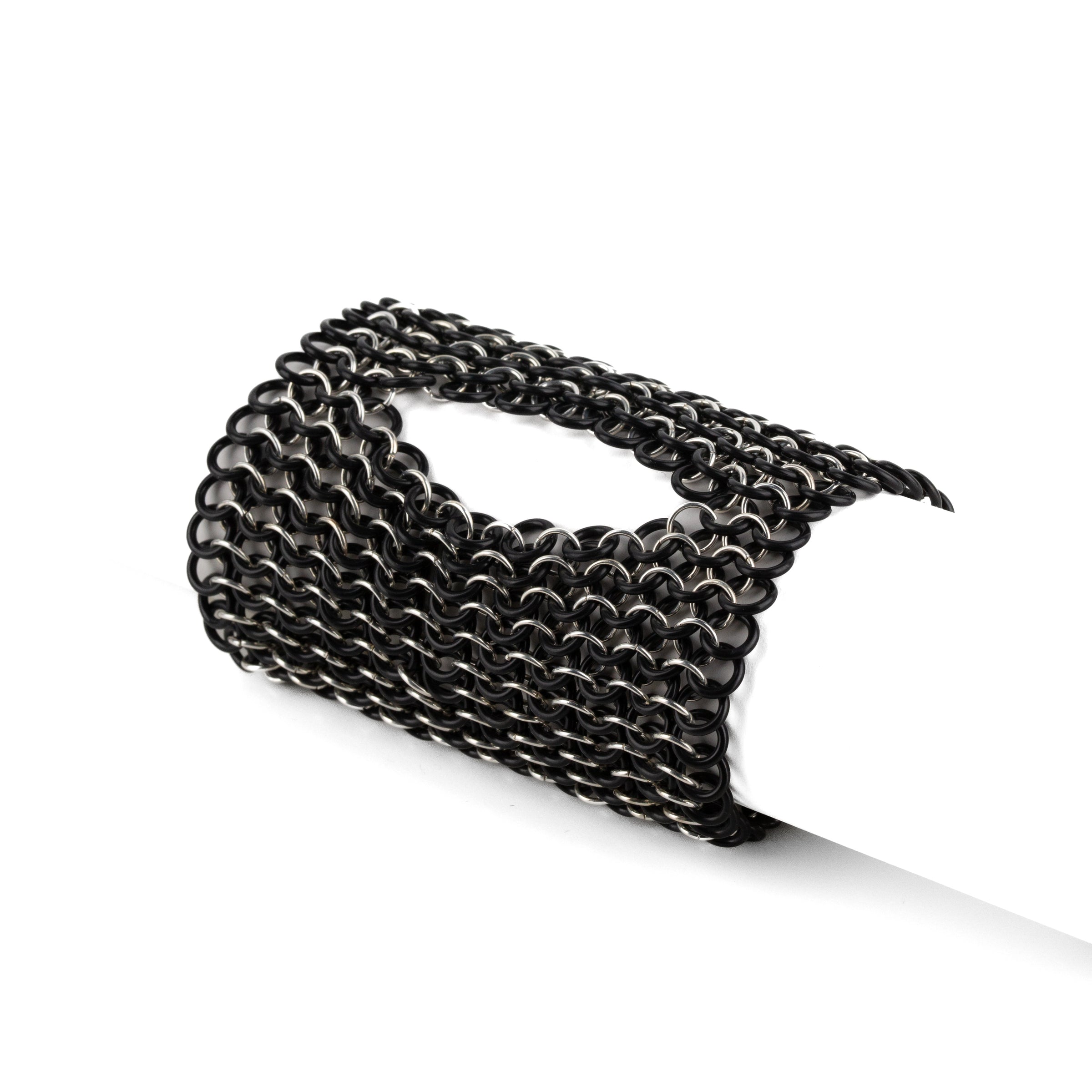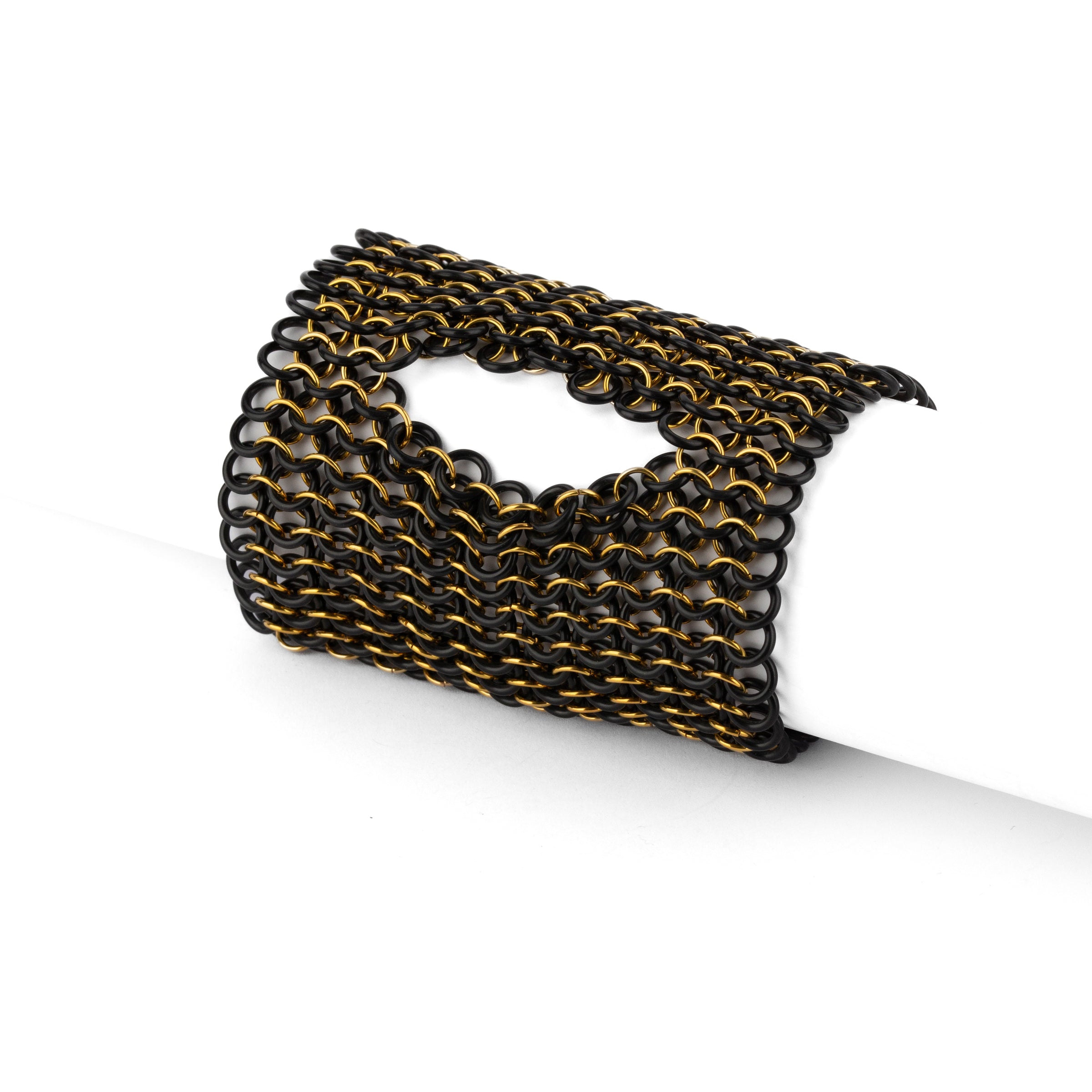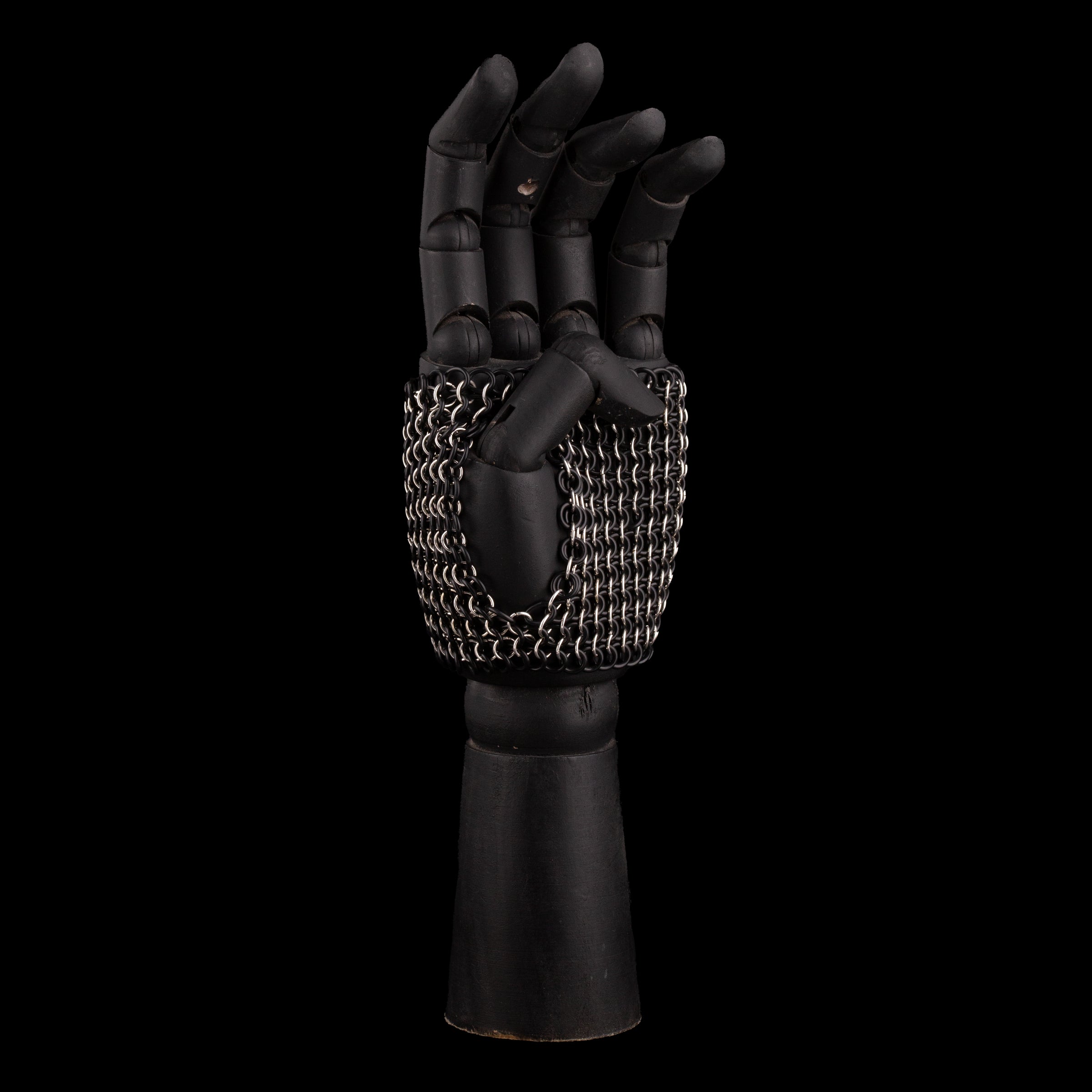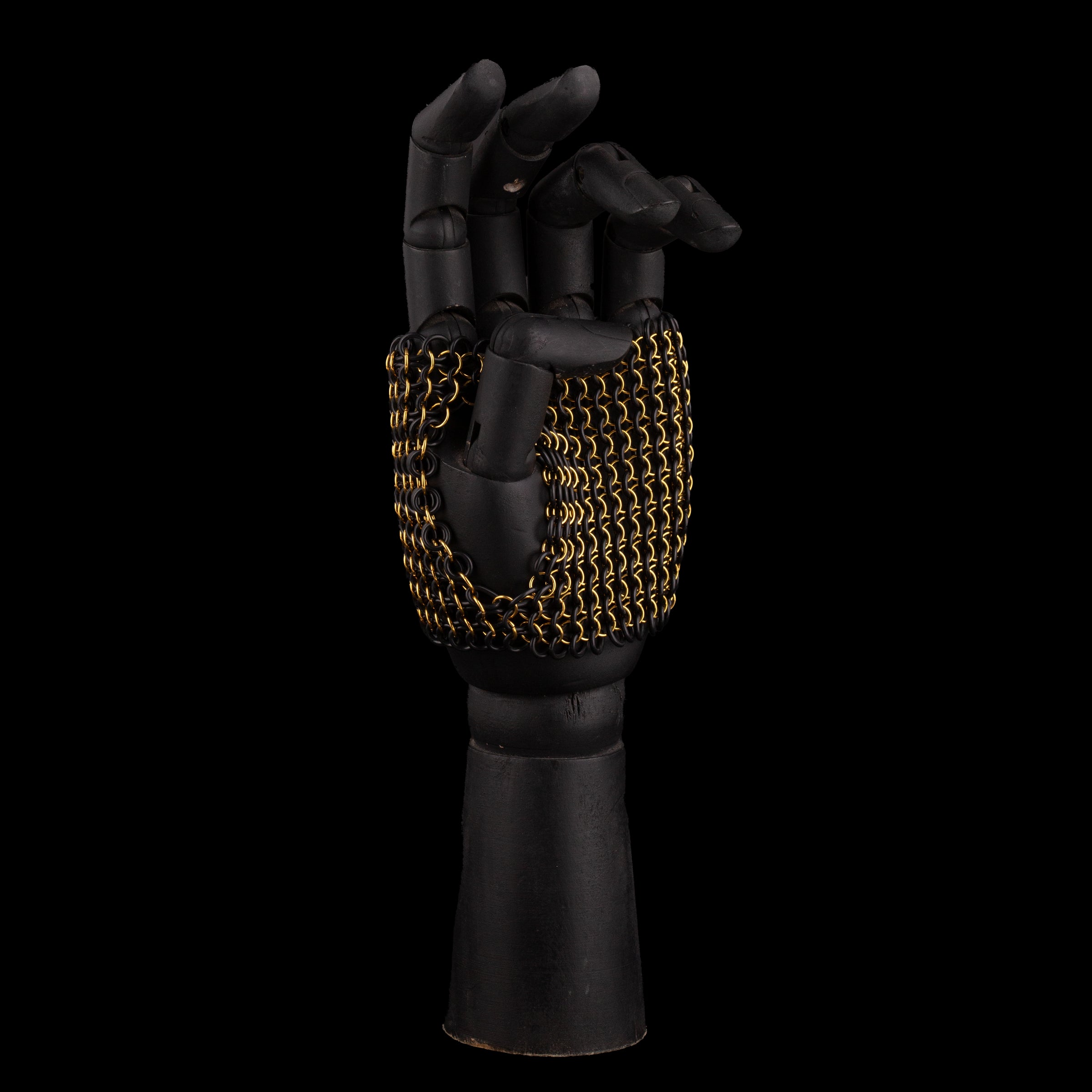 Elastic mesh glove, hand-woven with gold or silver plated rings, combined with rubber bands.