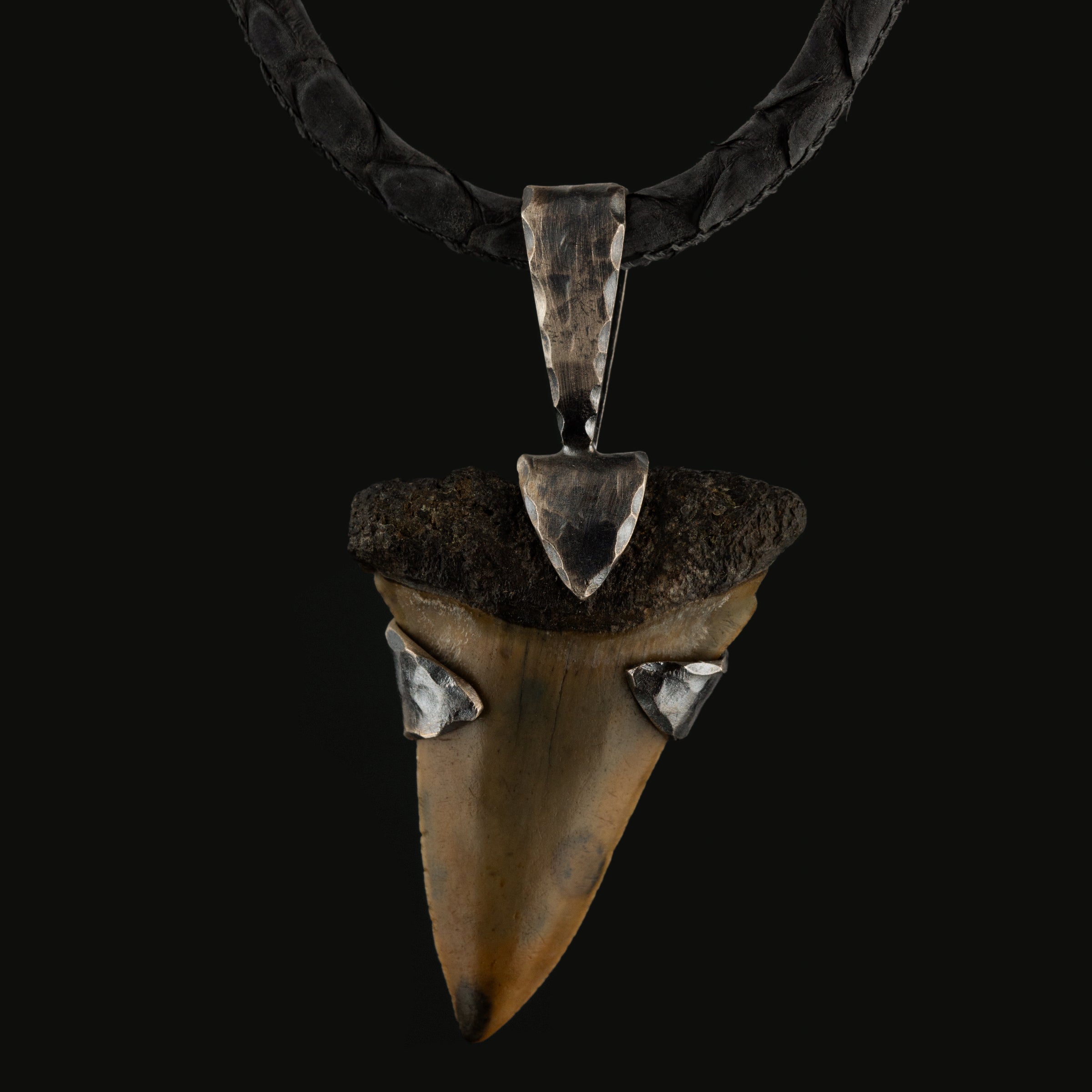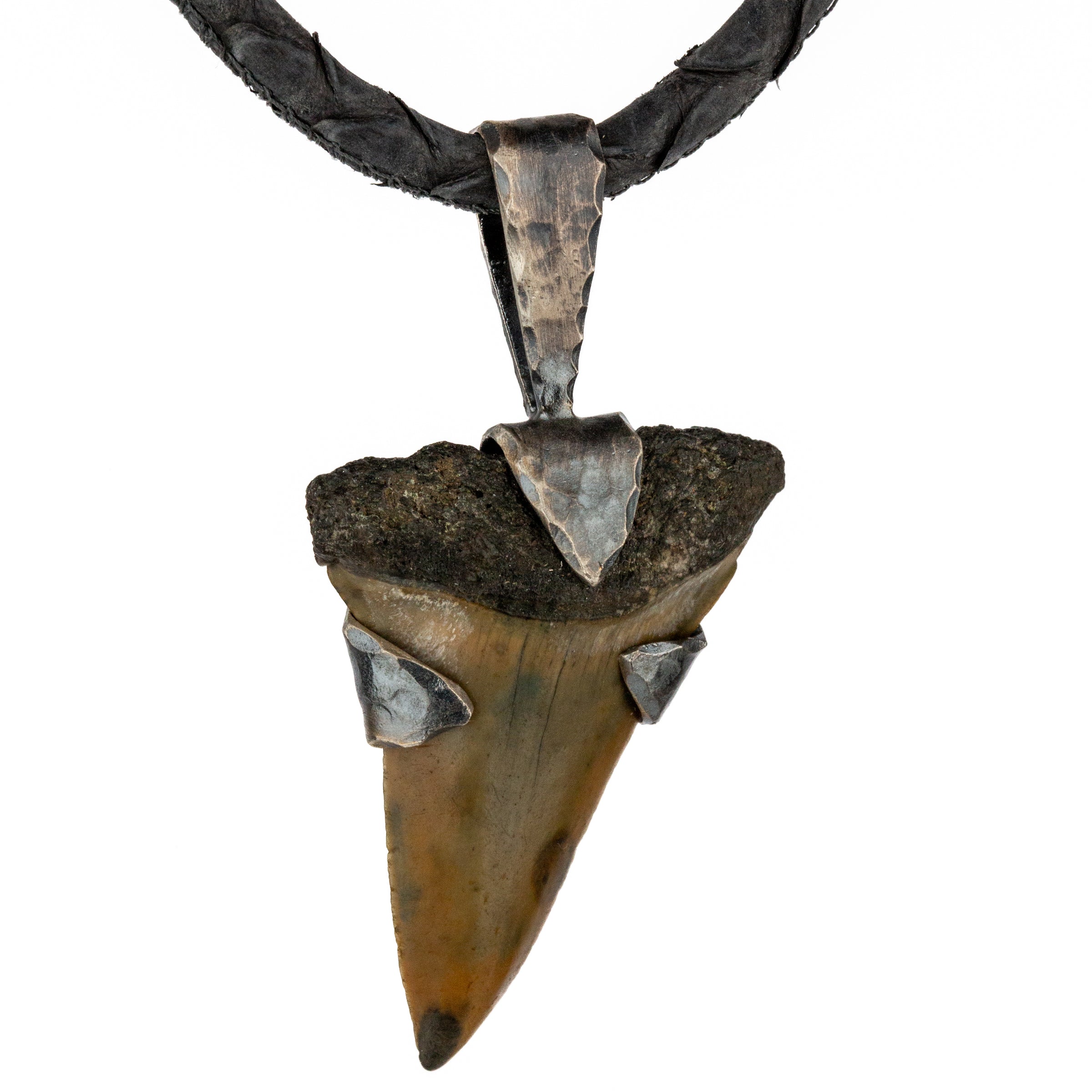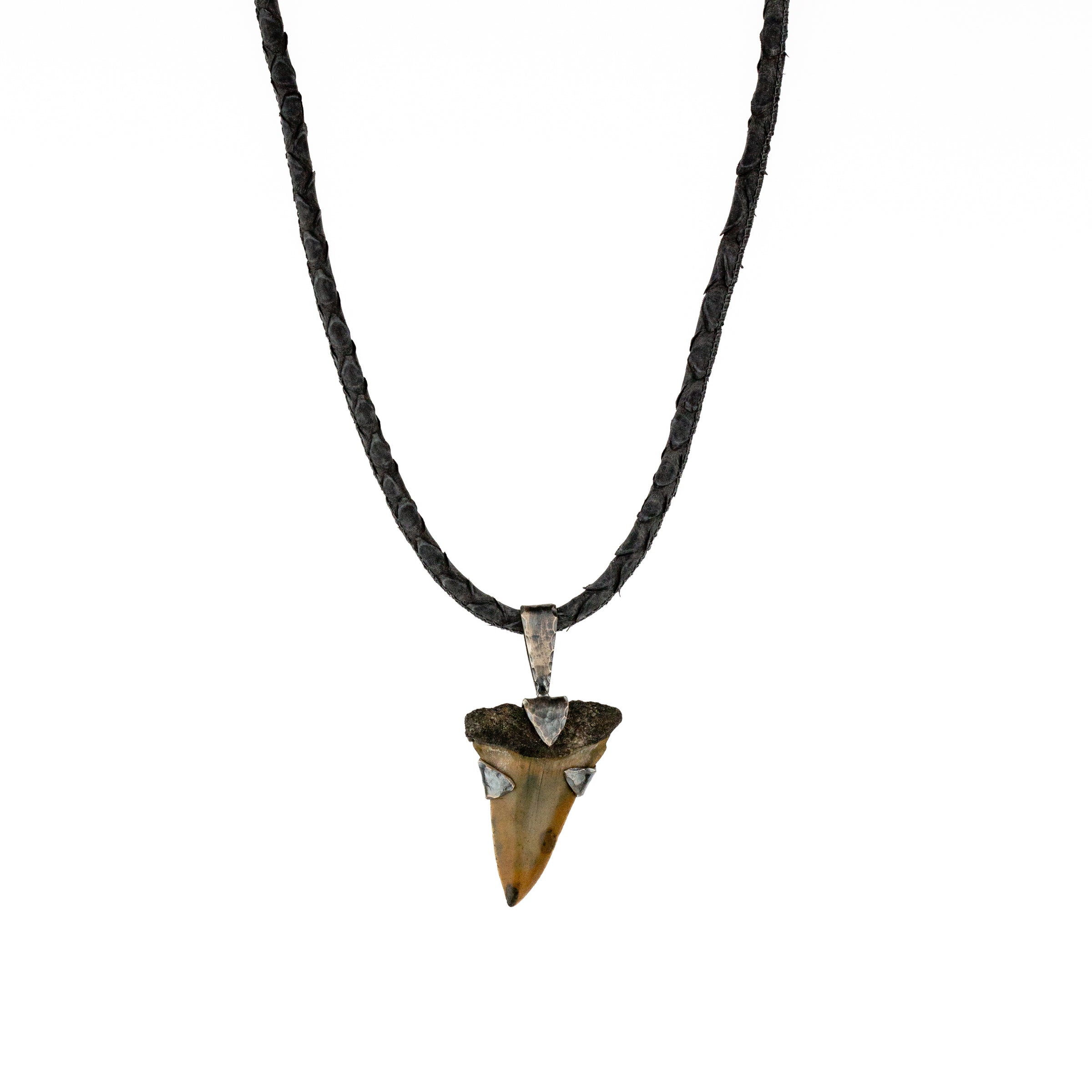 Collar de cuero con cierre magnético y colgante diente de Isurus engastado.