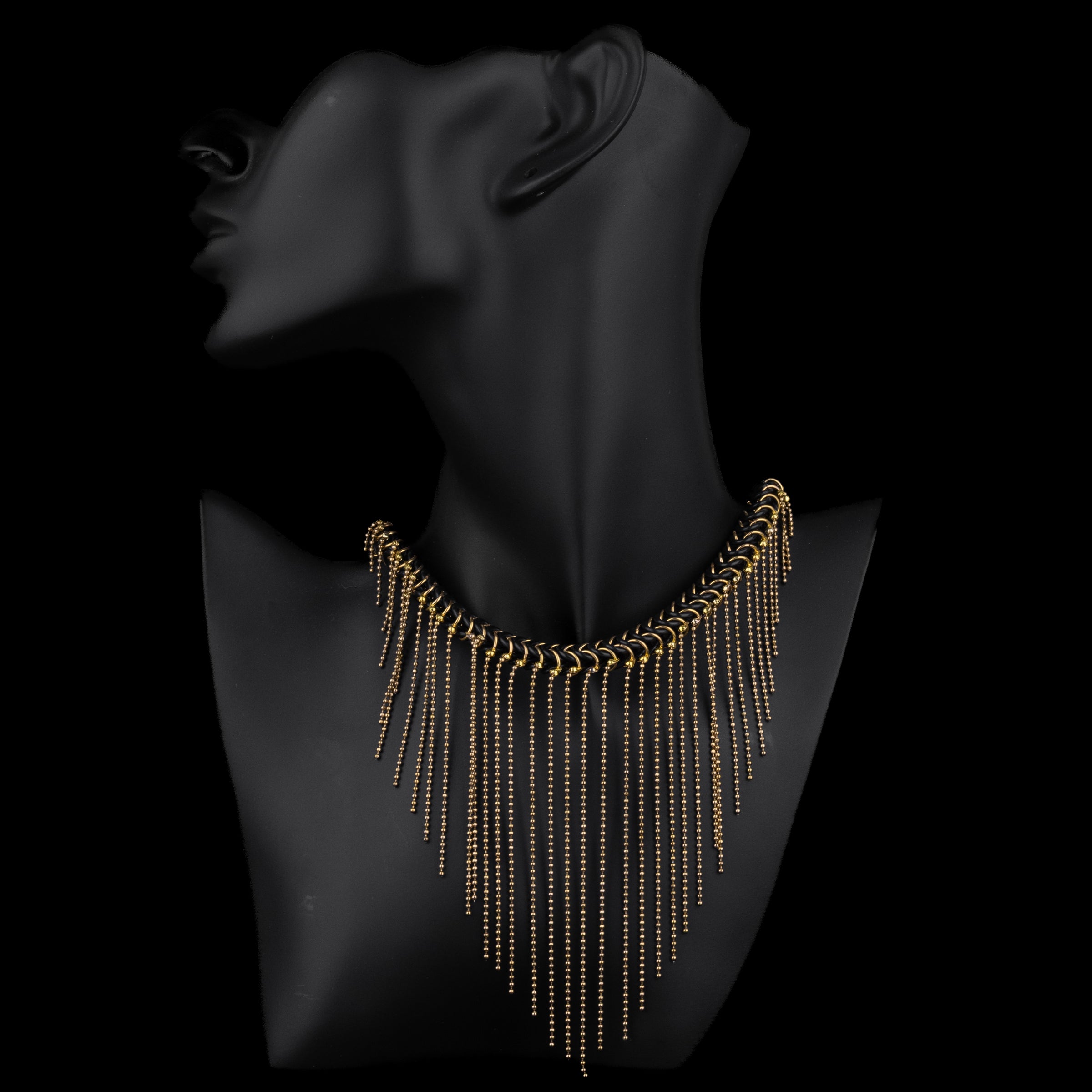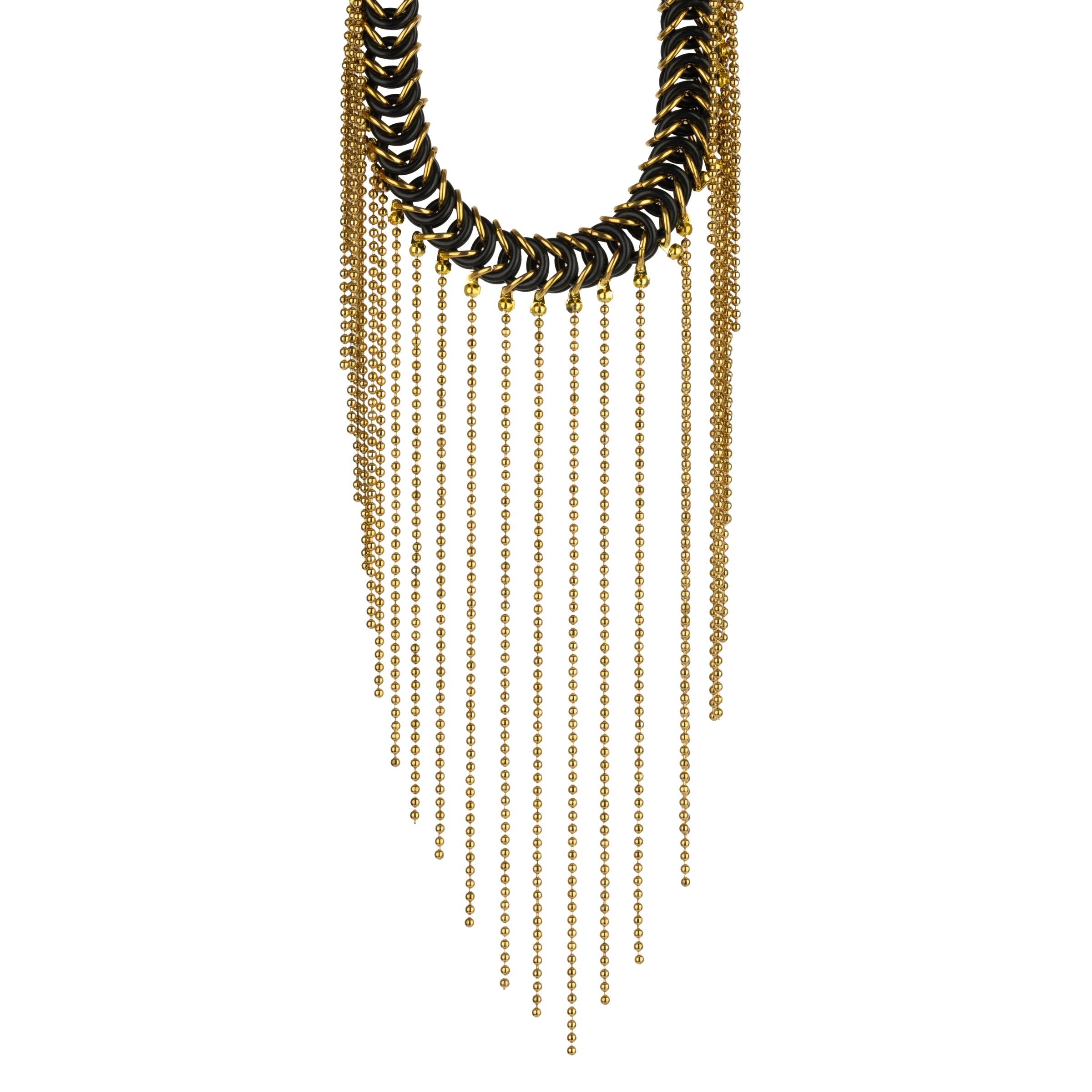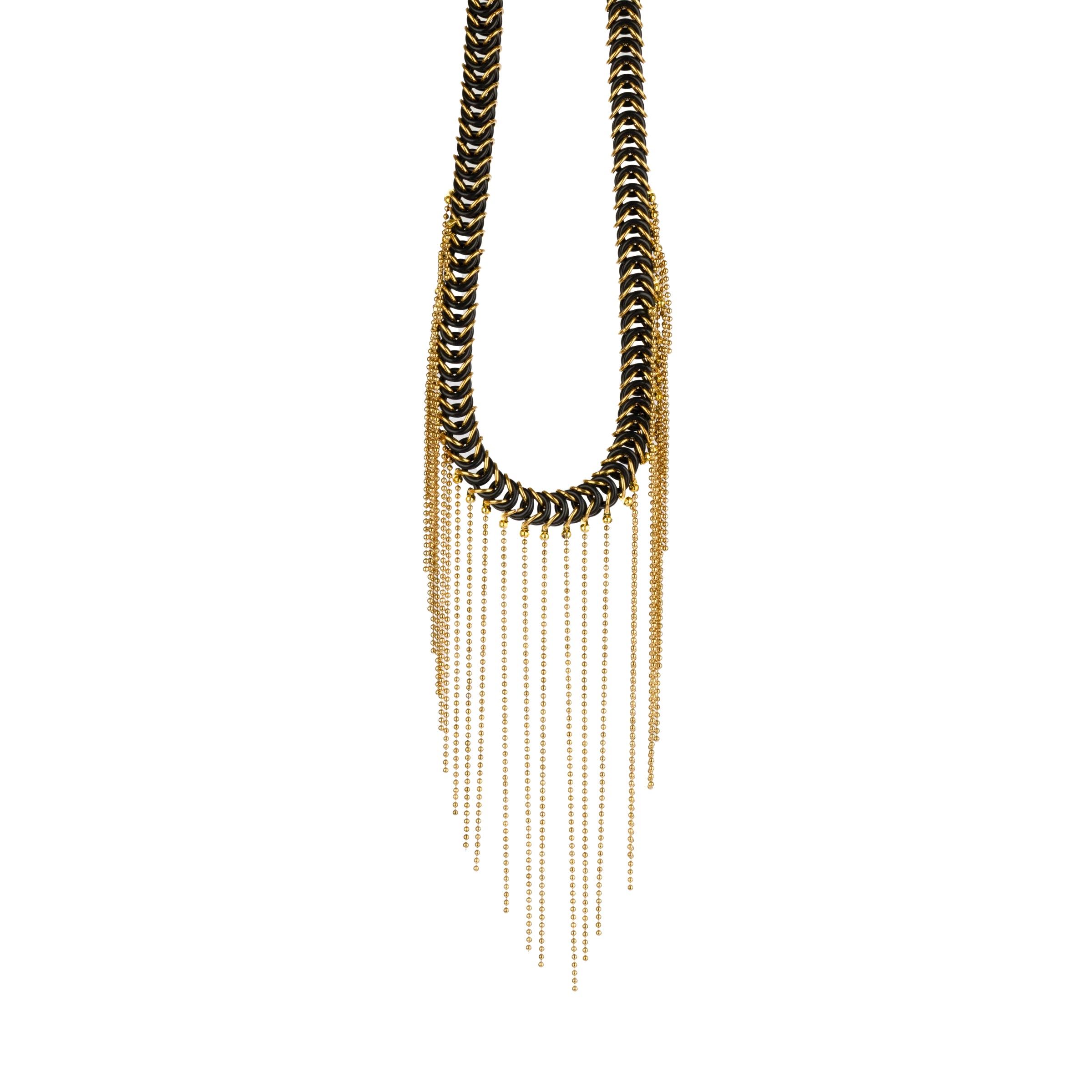 Collar de malla elástica, entrelazada a mano con anillas bañadas en oro o plata, combinadas con gomas de caucho.