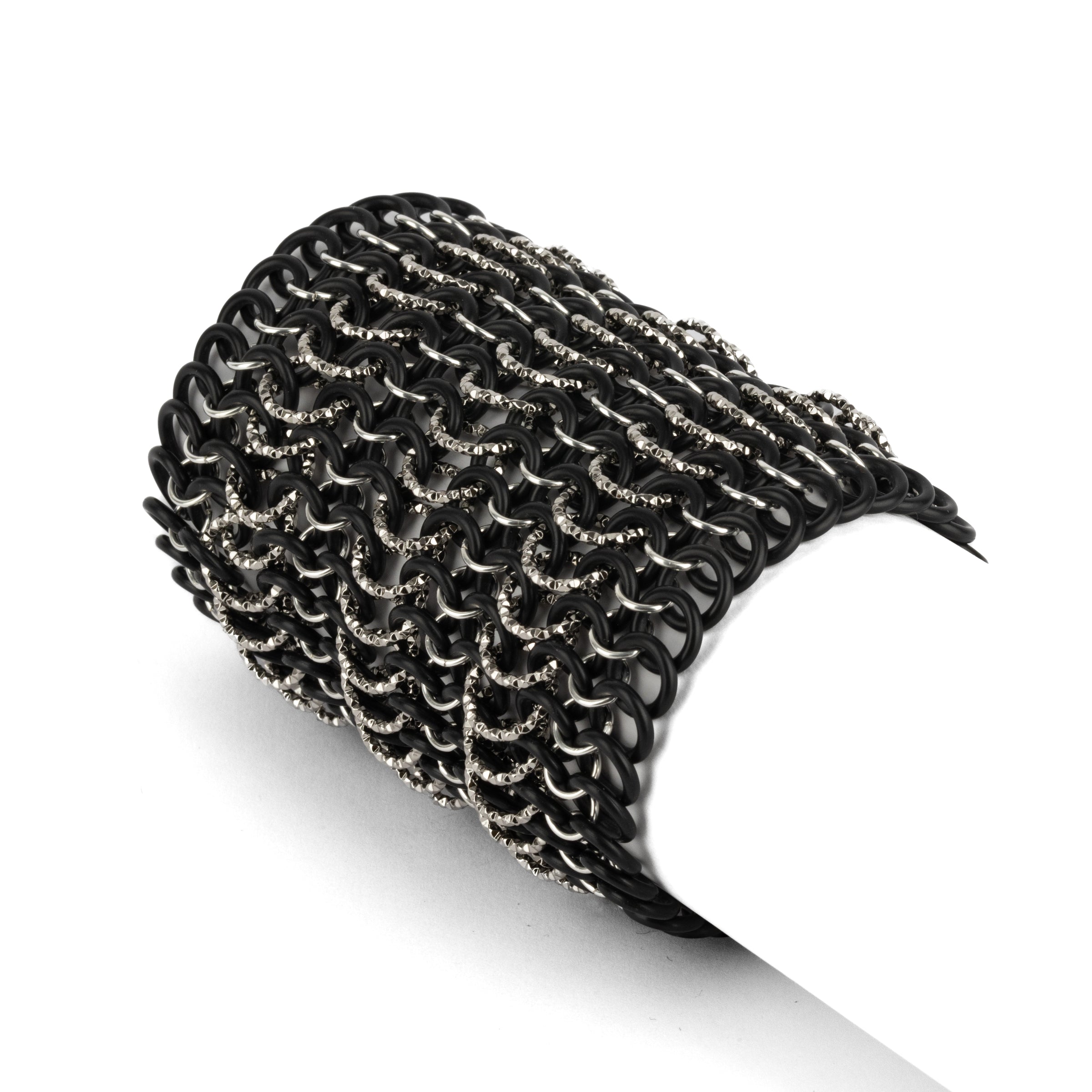 Pulsera de malla elástica, entrelazada a mano con anillas Diamond Cut bañadas en oro o plata, combinadas con gomas de caucho.
