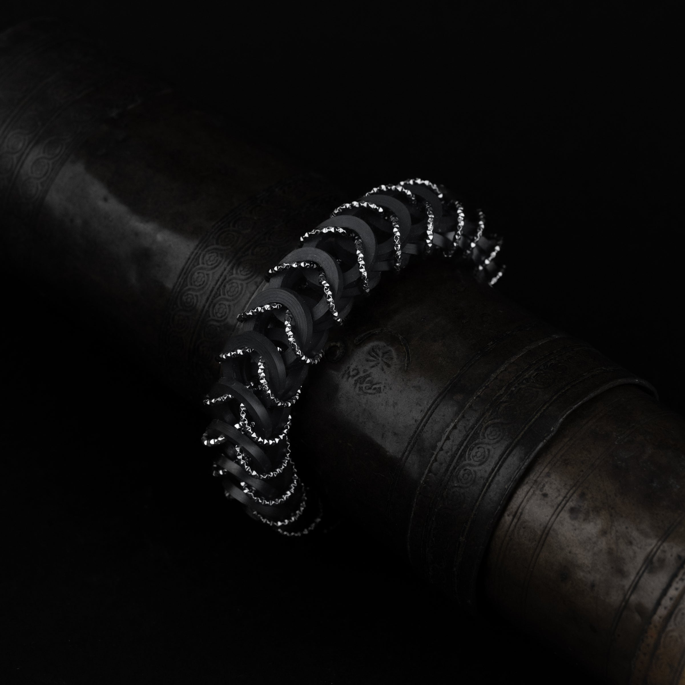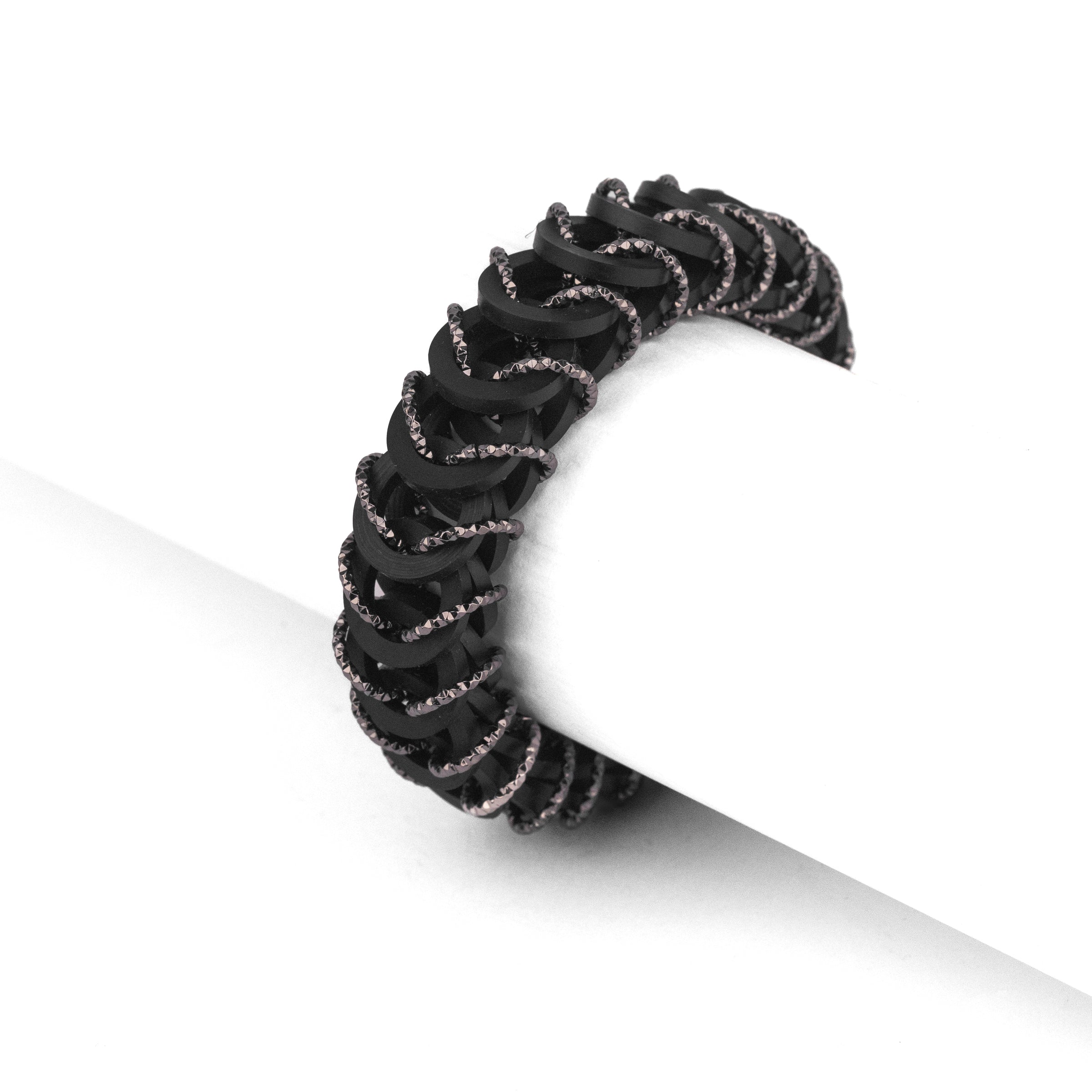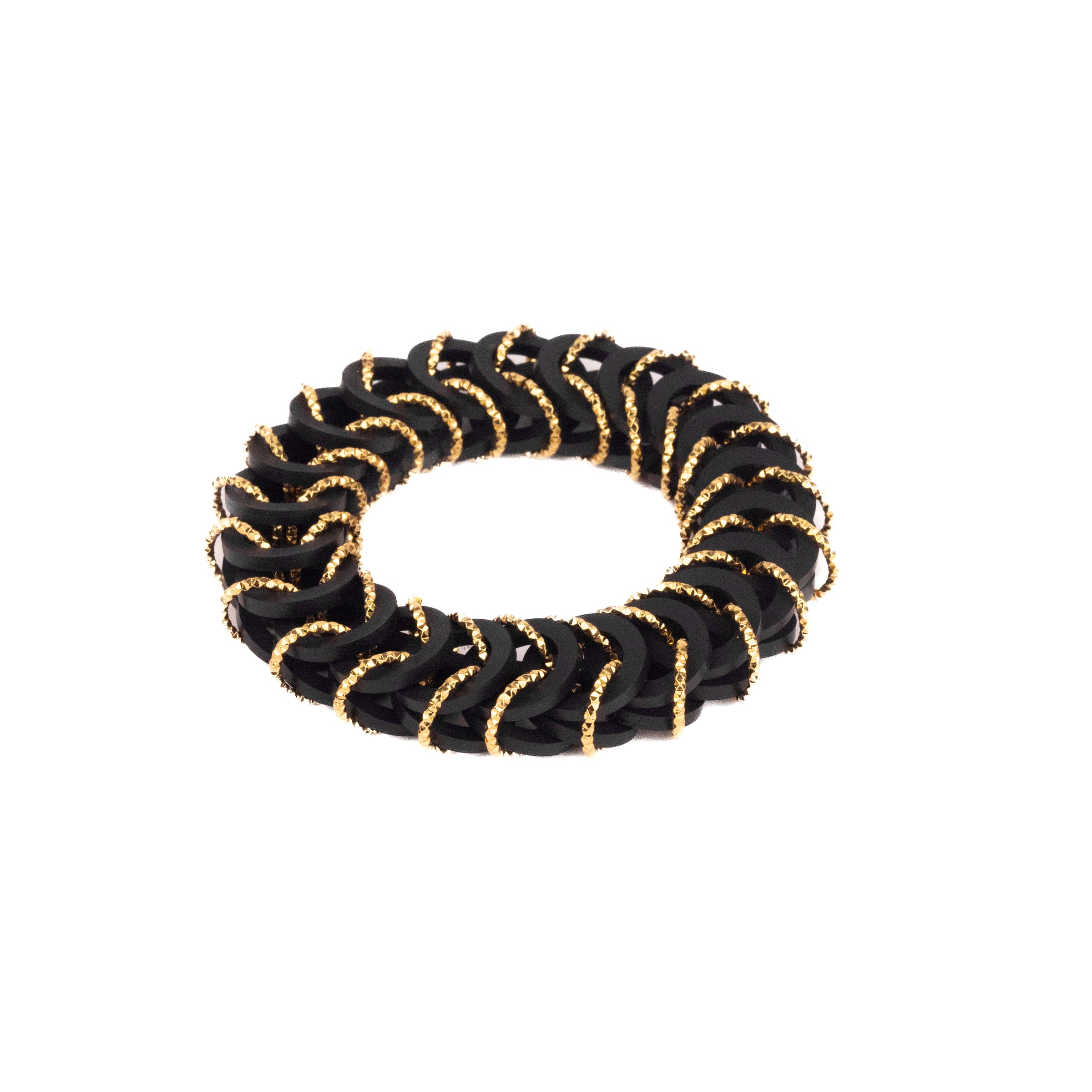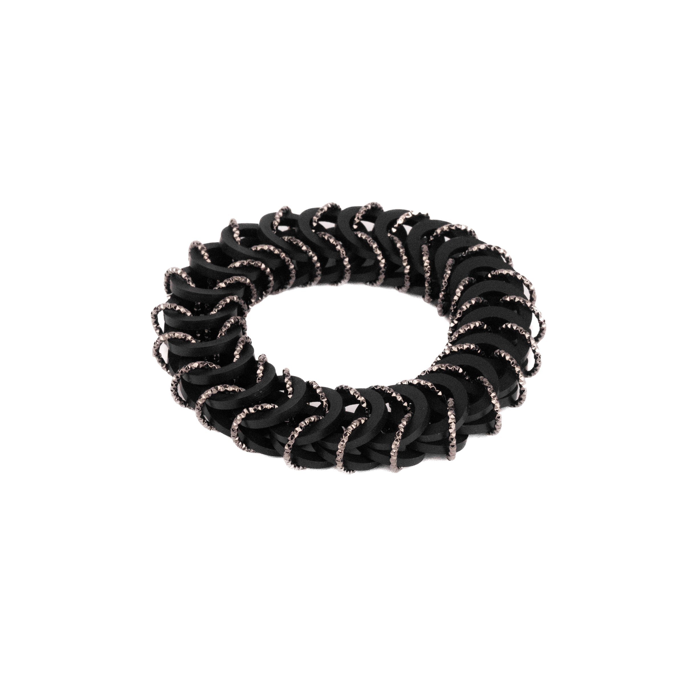 Pulsera de malla elástica, entrelazada a mano con anillas Diamond Cut bañadas en oro o plata, combinadas con gomas de caucho.