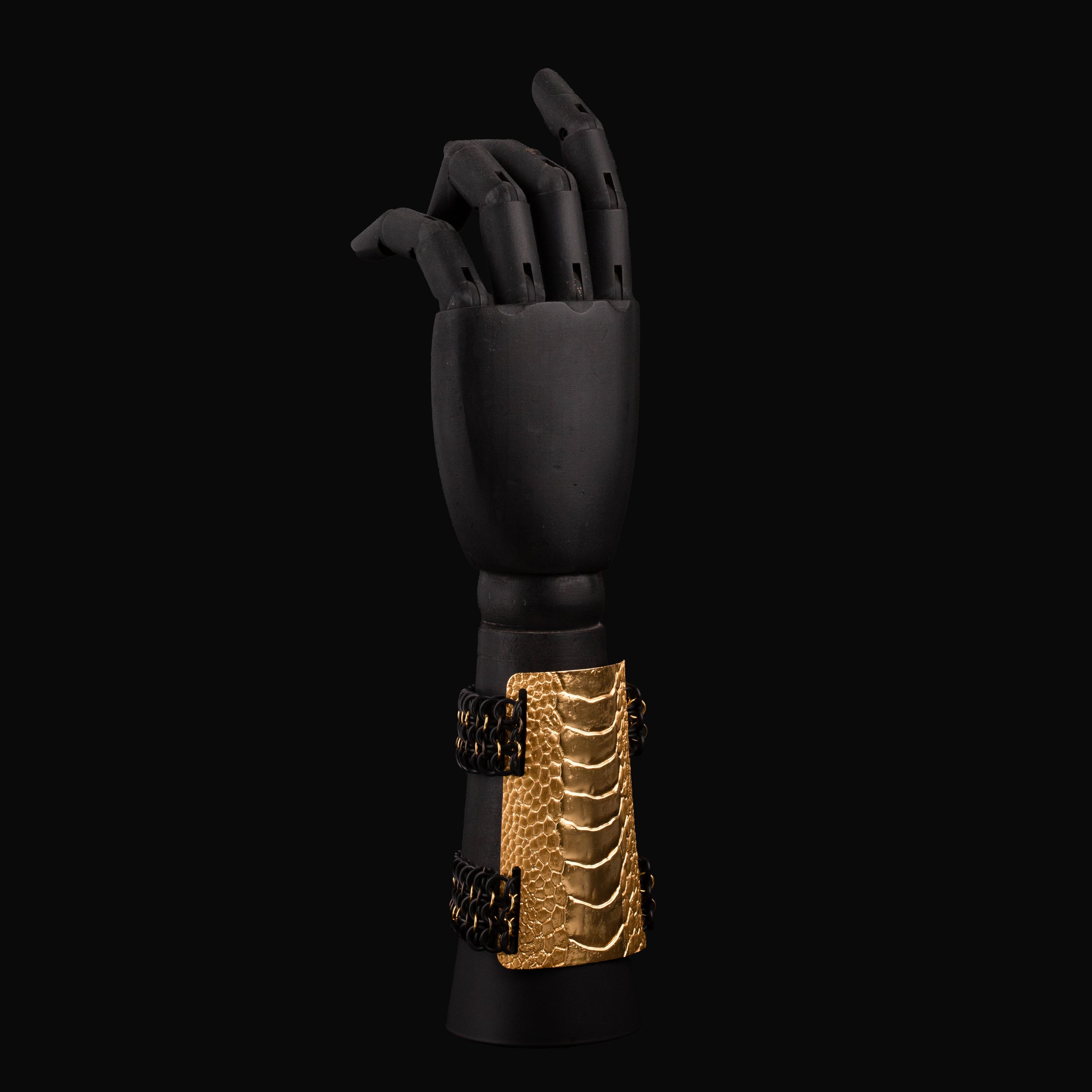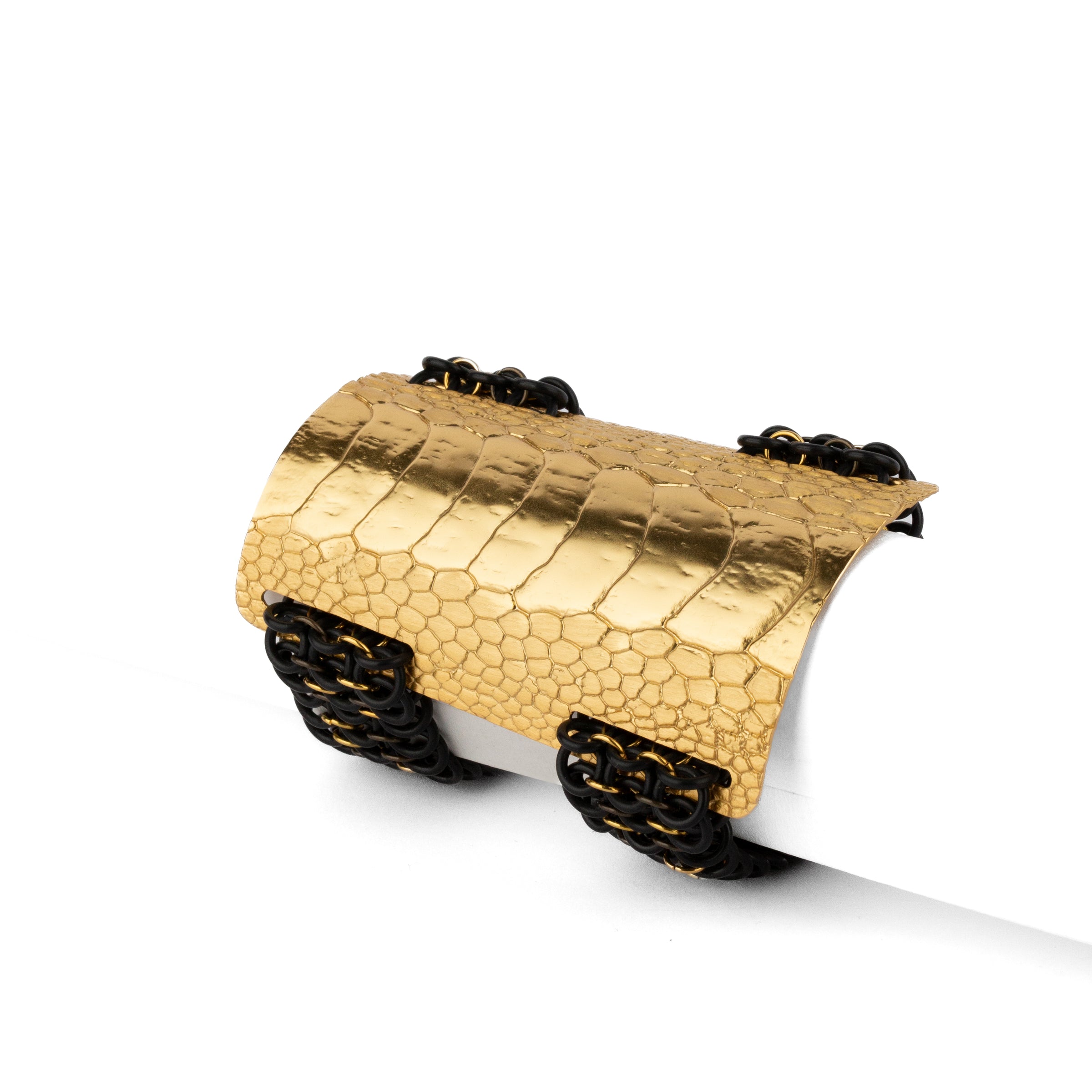 Pulsera de malla elástica, entrelazada a mano con anillas y piezas bañadas en oro o plata, combinadas con gomas de caucho.
