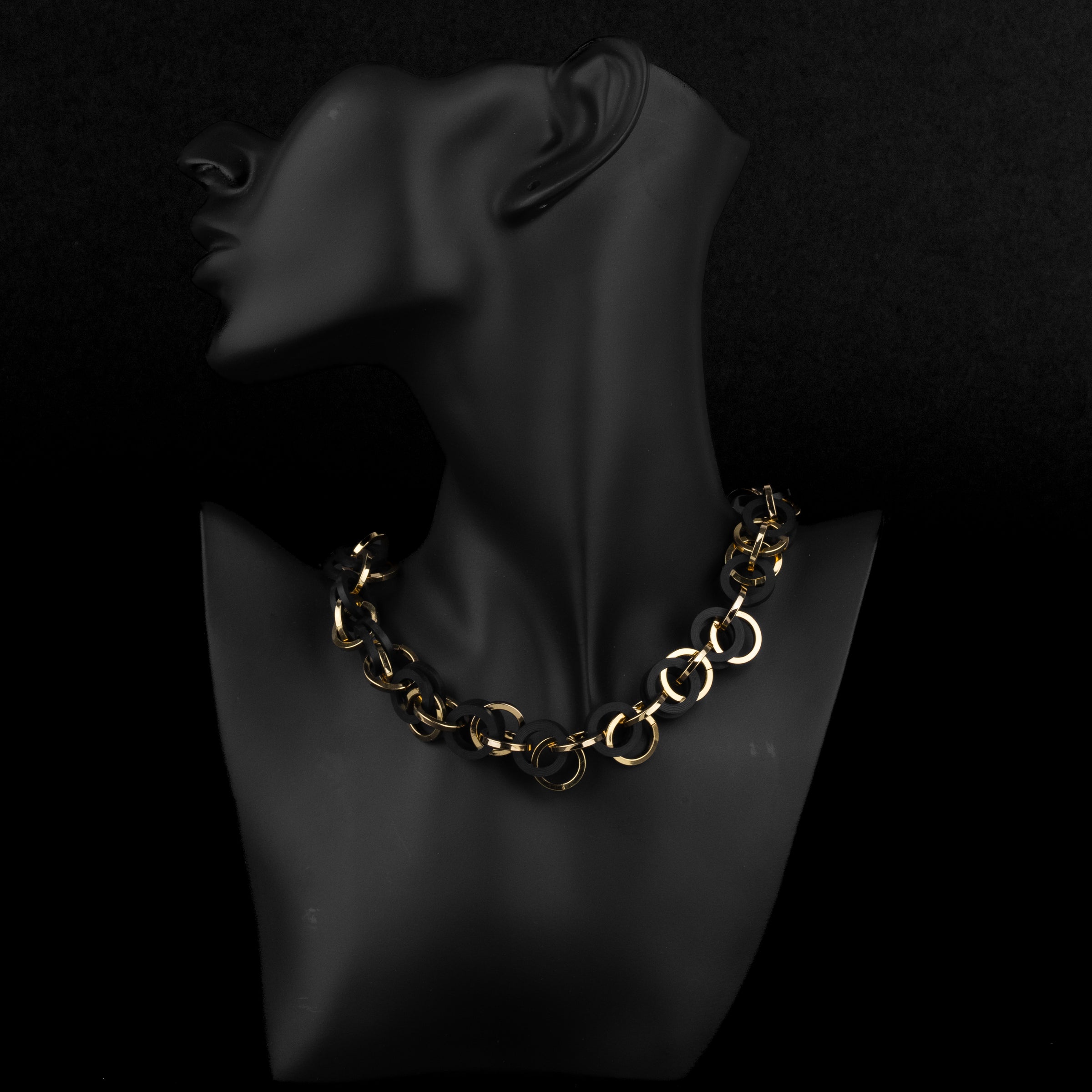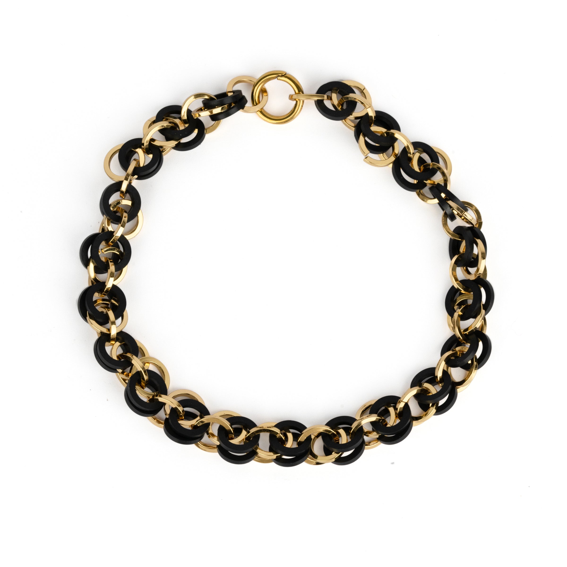 Collar de malla elástica, entrelazada a mano con anillas gruesas bañadas en oro, combinadas con gomas de caucho. Cierre de argolla invisible.