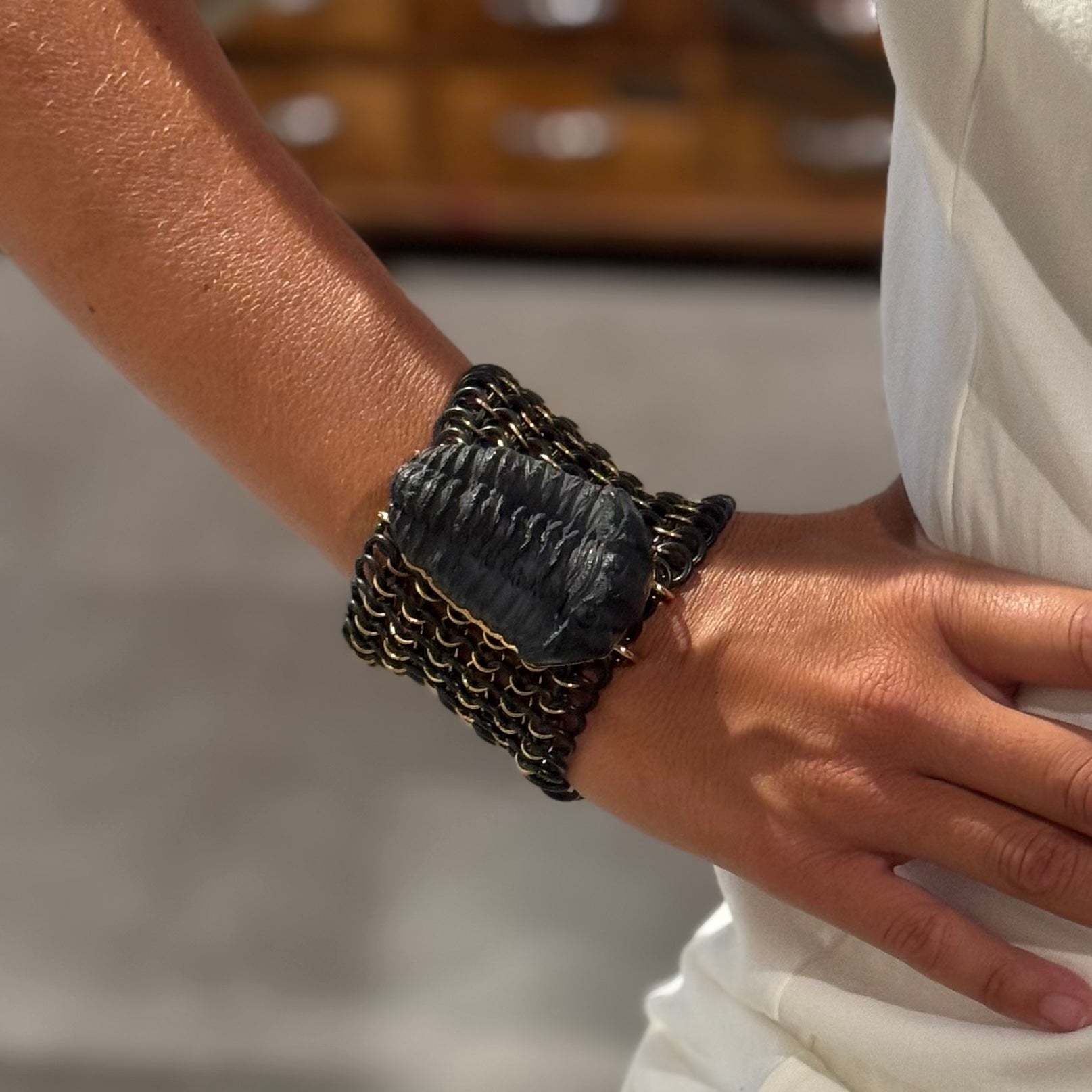 Bracciale composto da anelli in ottone placcato e fasce elastiche in gomma.