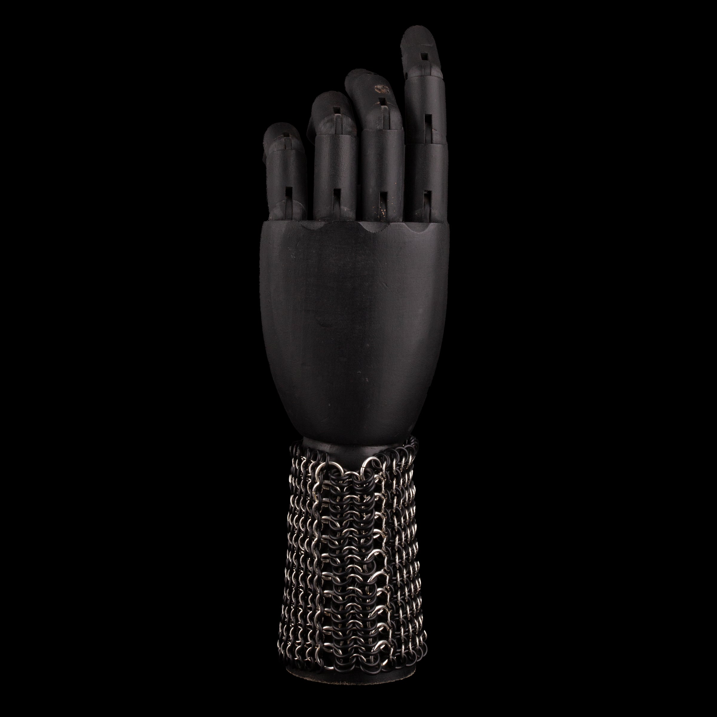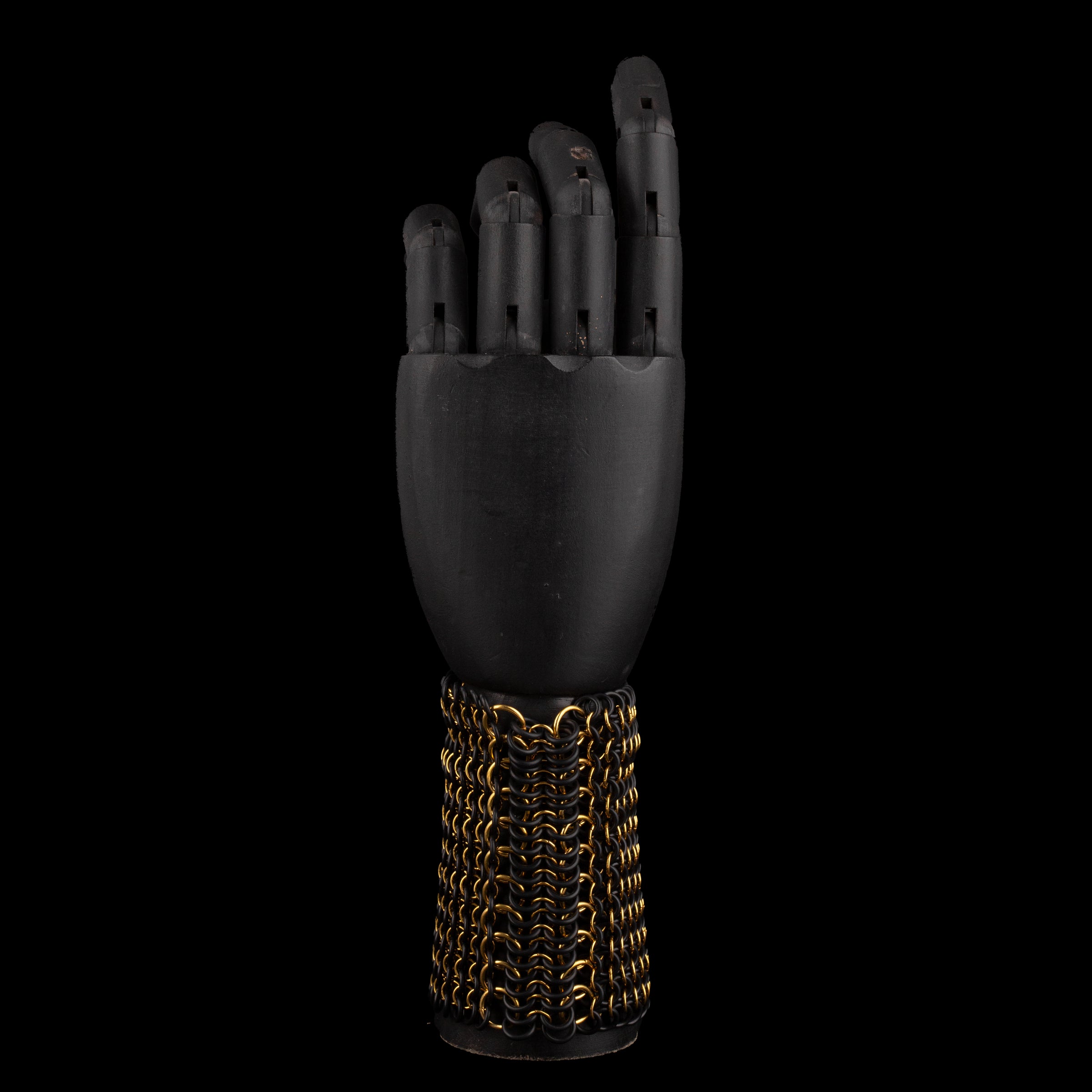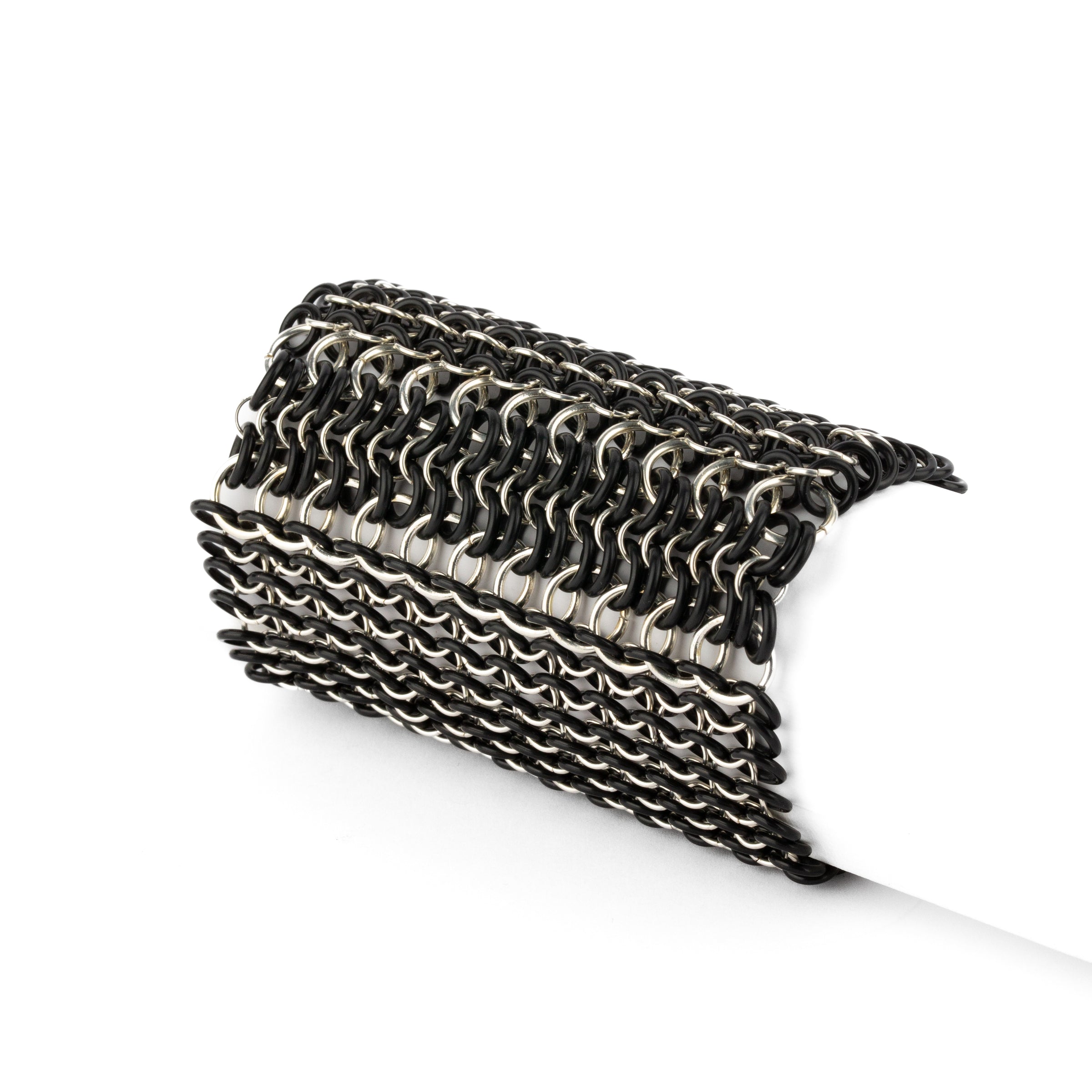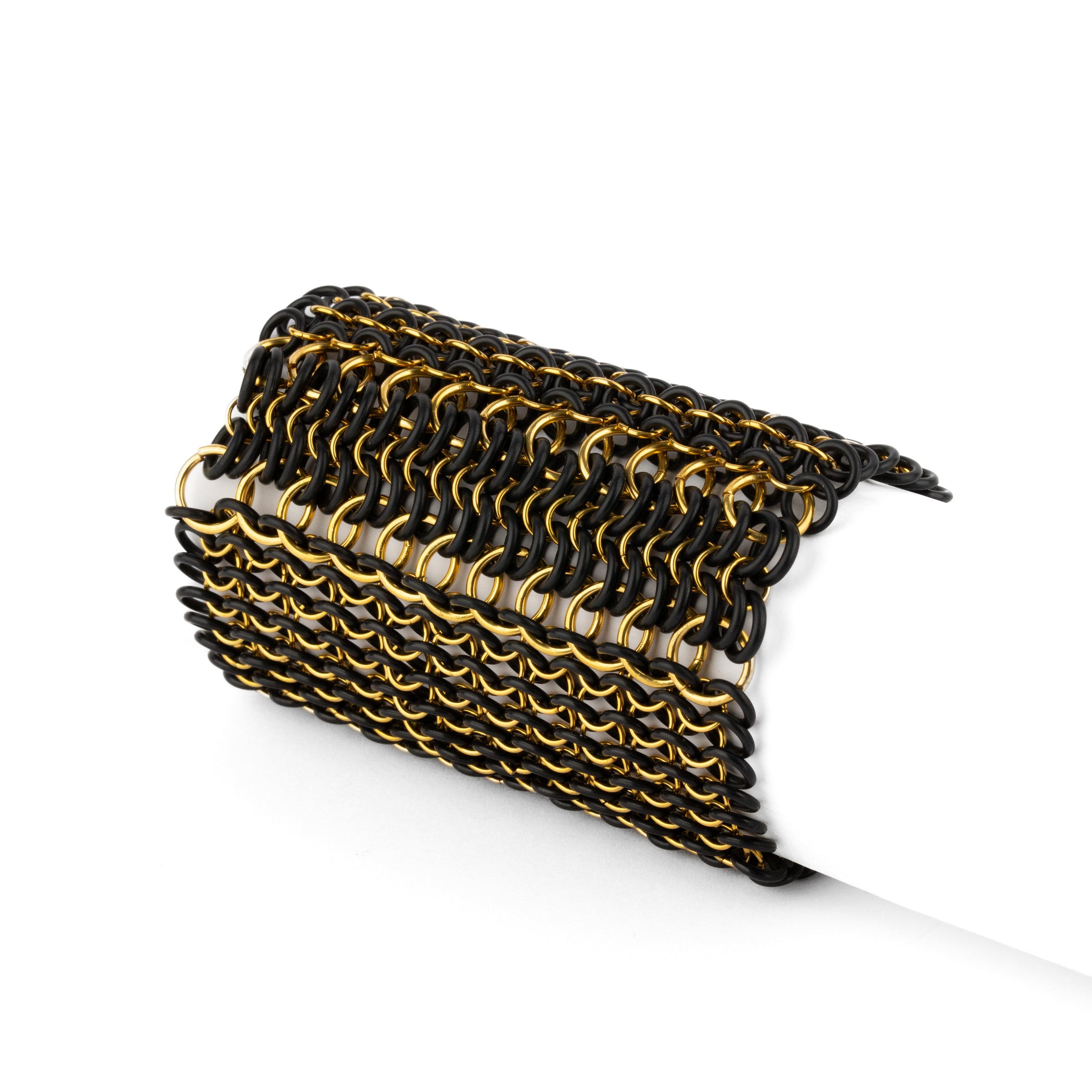 Pulsera de malla elástica, entrelazada a mano con anillas bañadas en oro o plata, combinadas con gomas de caucho.