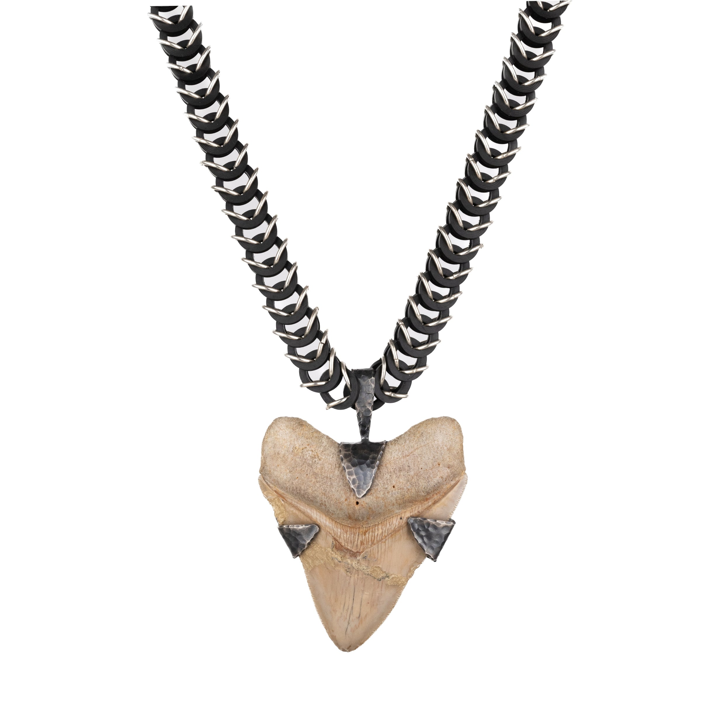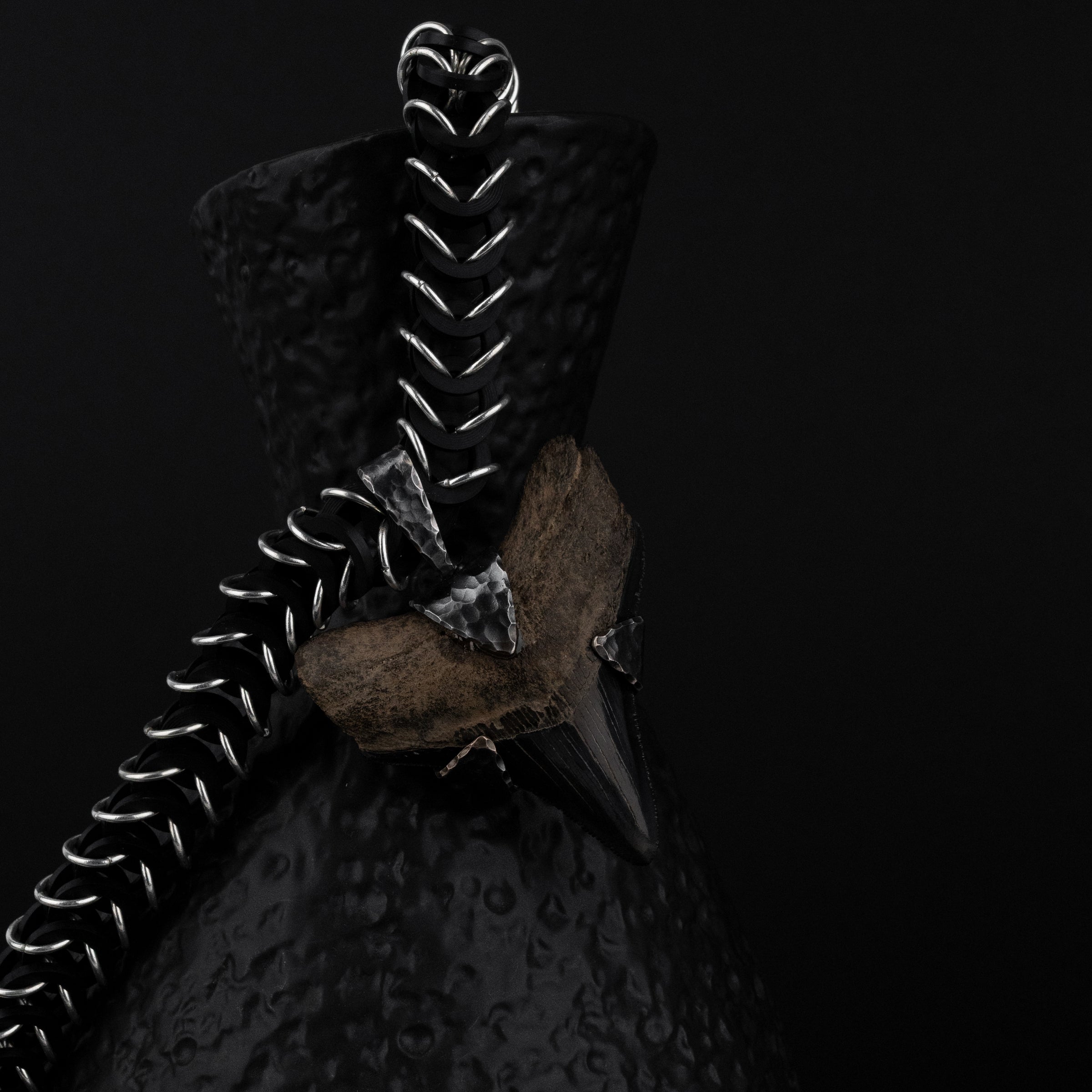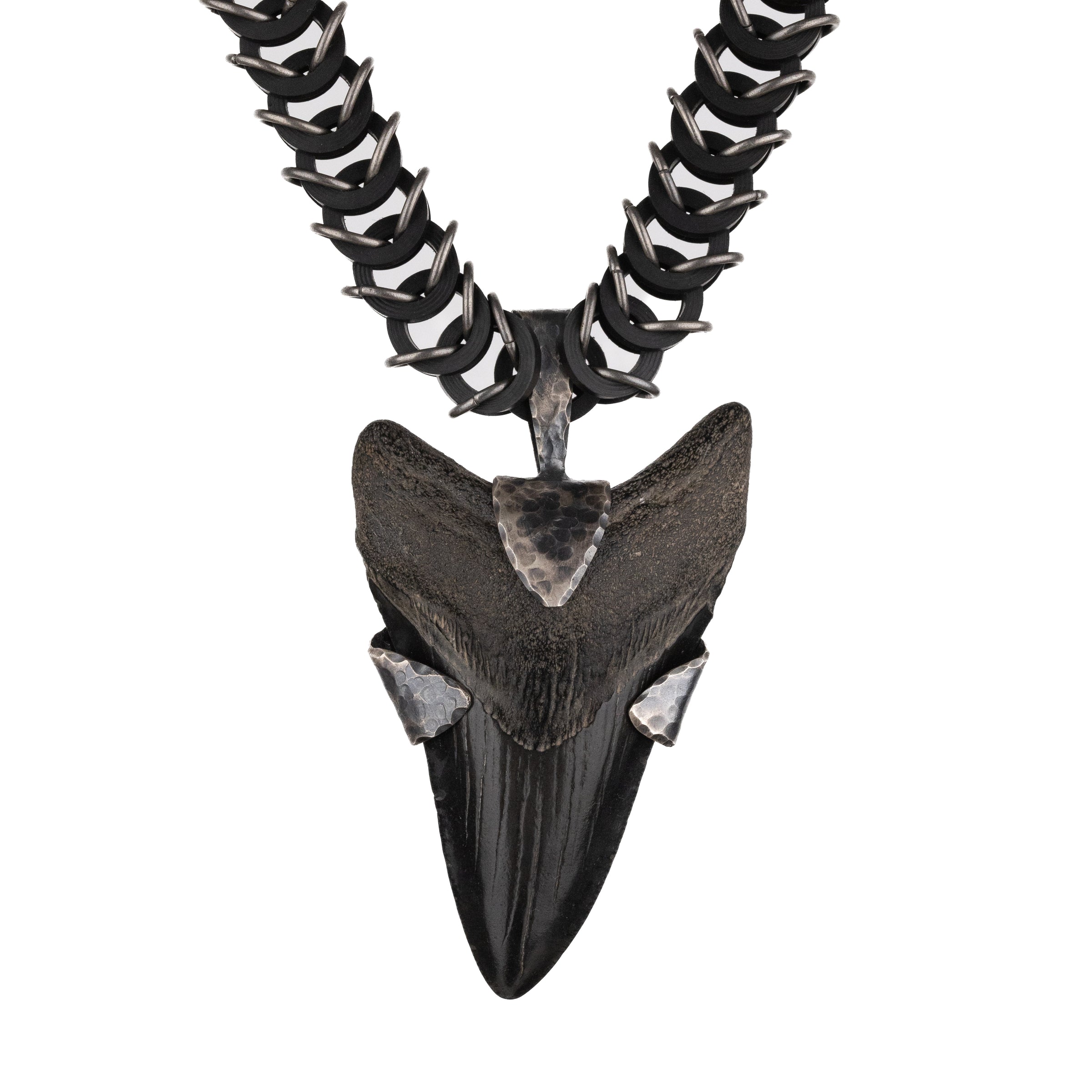 Collar de malla elástica, entrelazada a mano con anillas bañadas en plata, combinadas con gomas de caucho. Colgante diente fósil de megalodón con engaste en plata.