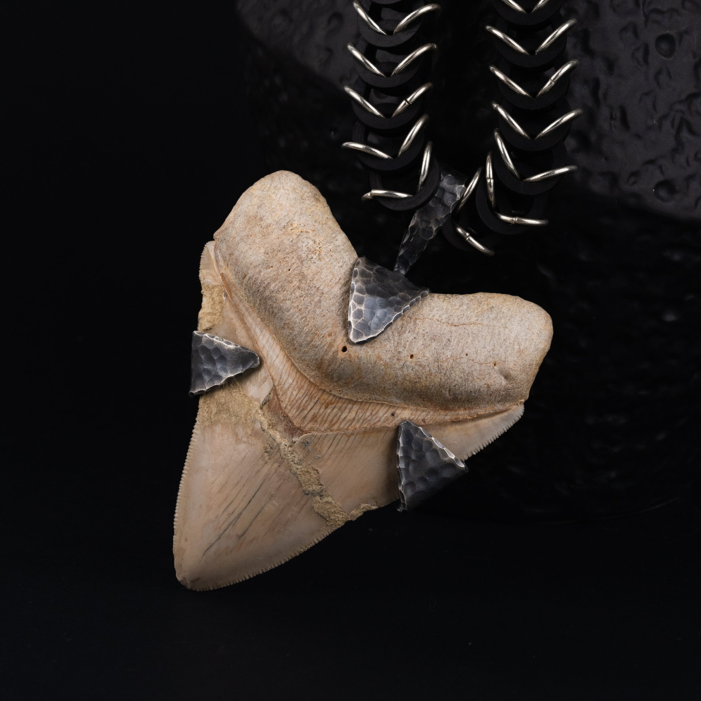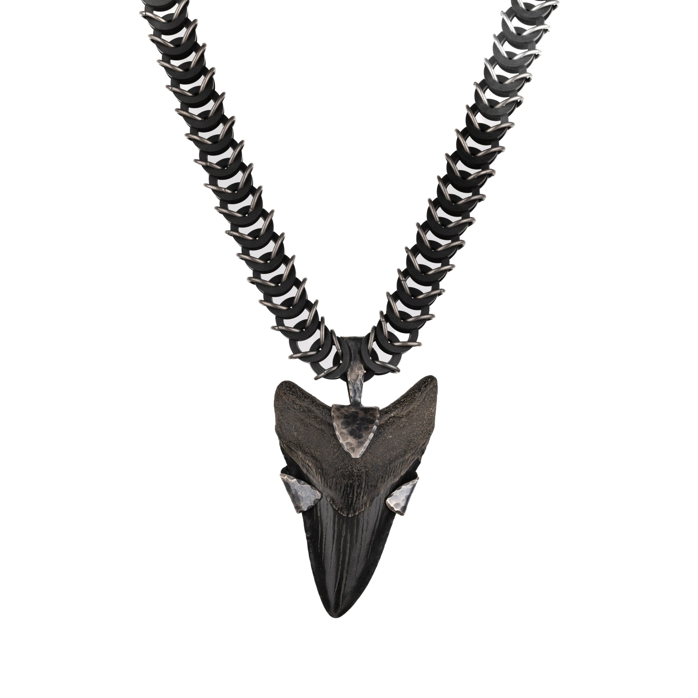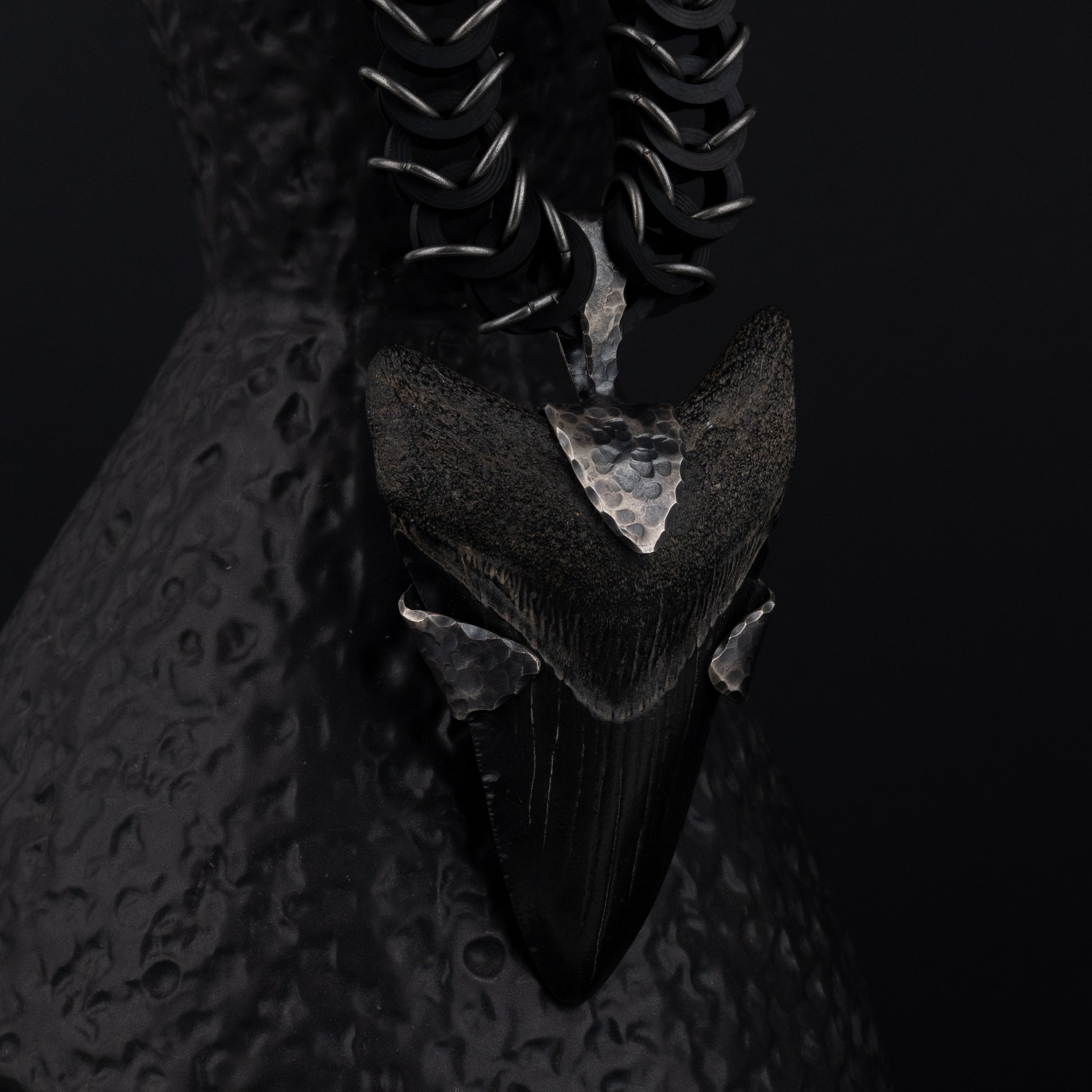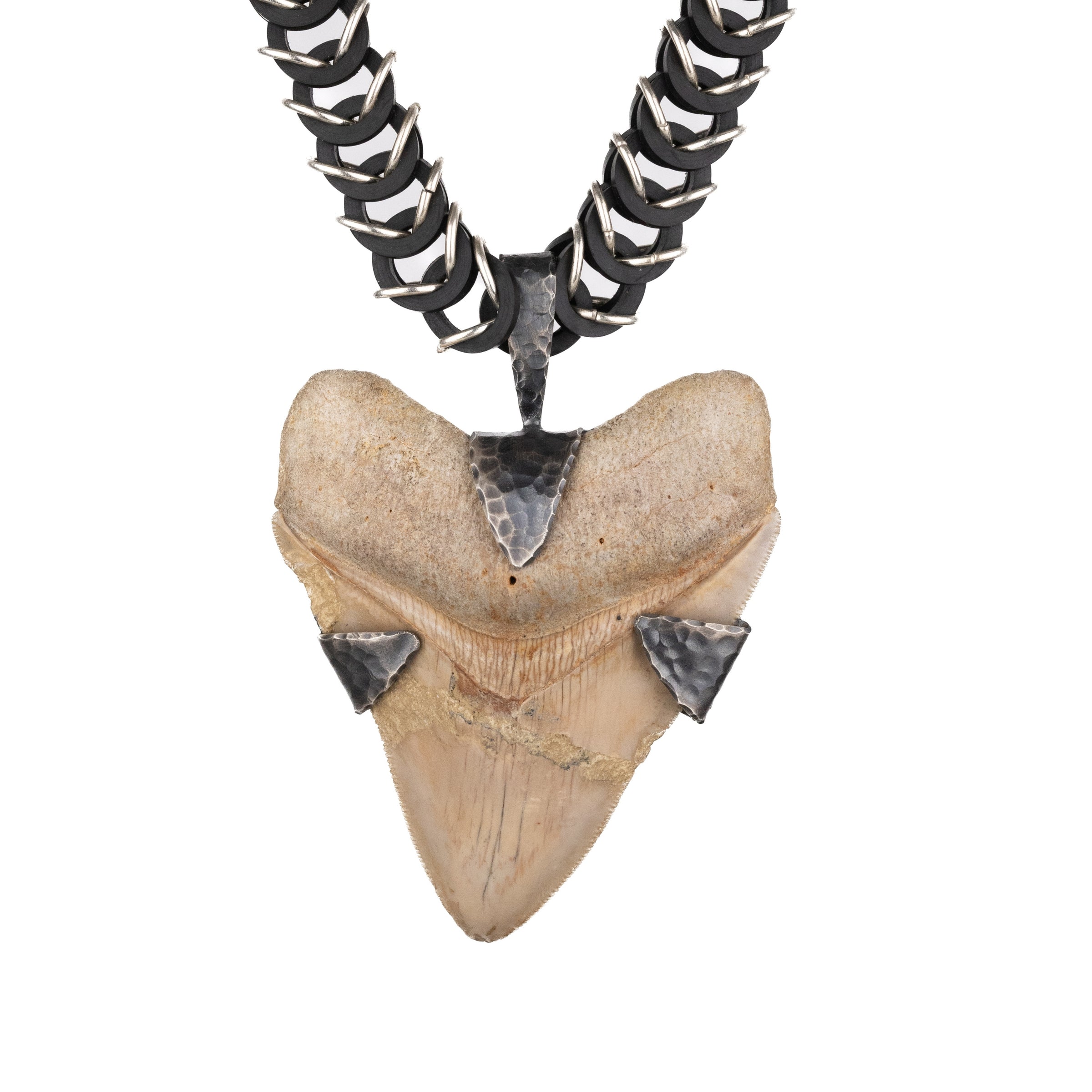 Collar de malla elástica, entrelazada a mano con anillas bañadas en plata, combinadas con gomas de caucho. Colgante diente fósil de megalodón con engaste en plata.