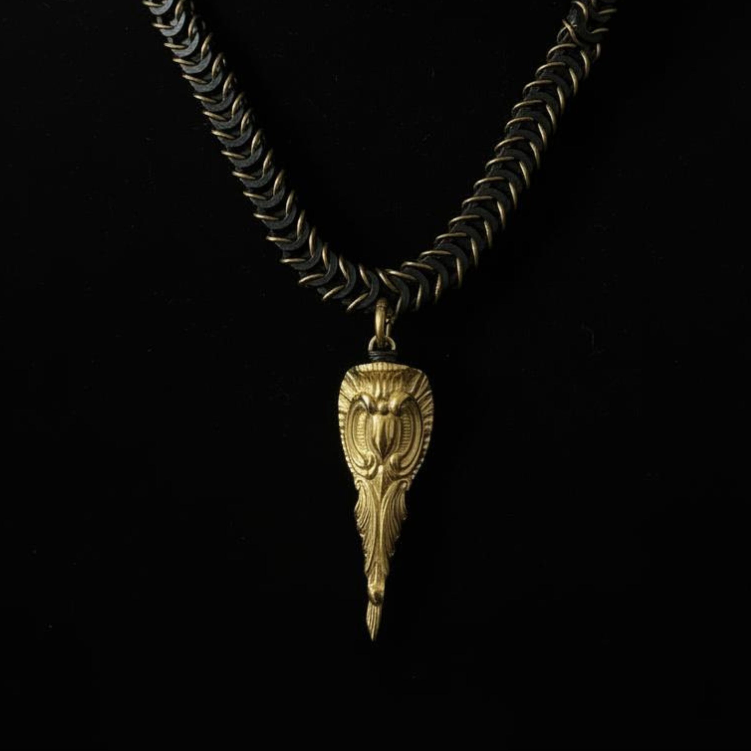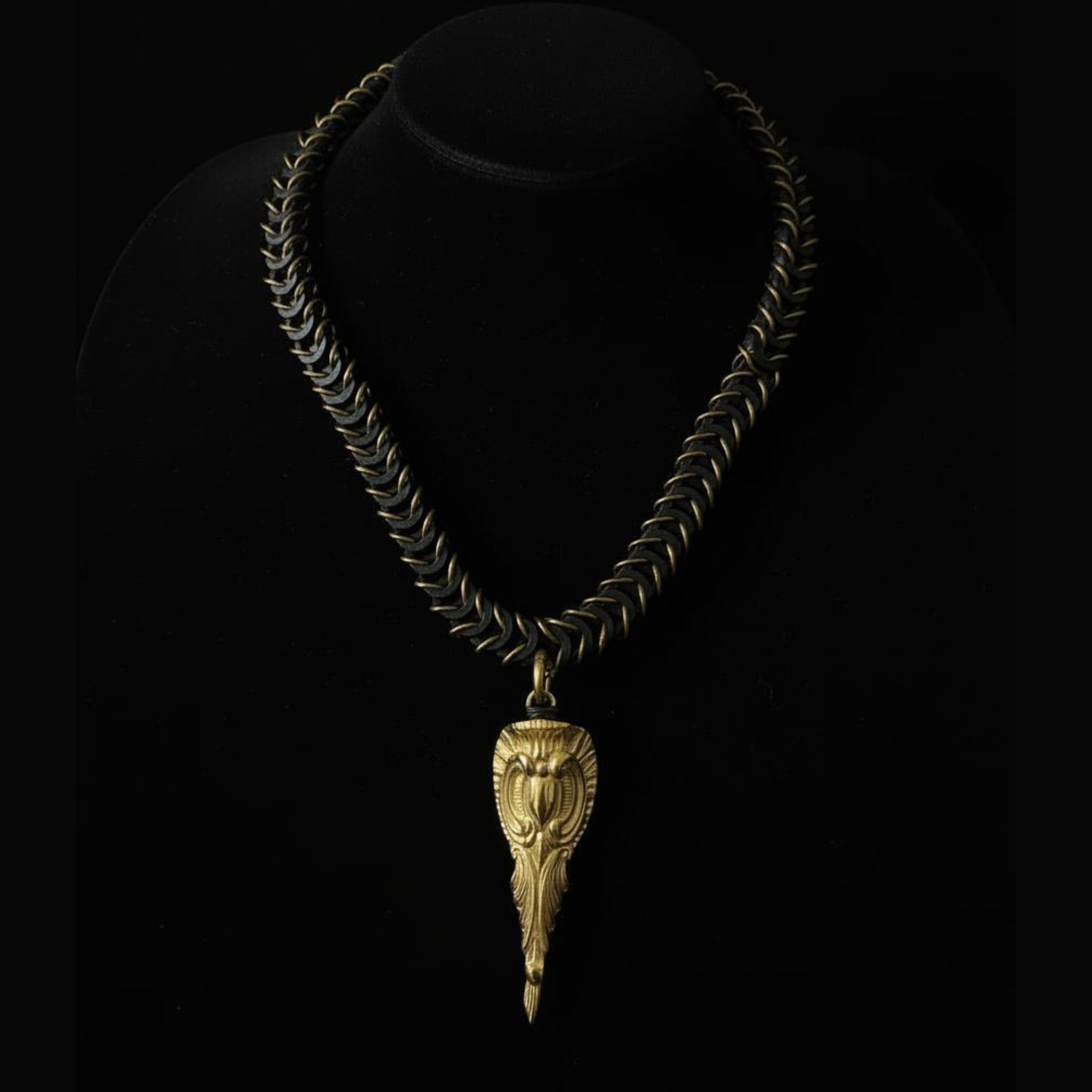 Collar de malla elástica, entrelazada a mano con anillas bañadas en oro o plata, combinadas con gomas de caucho. Colgante bañado en oro o plata (según la variante elegida).