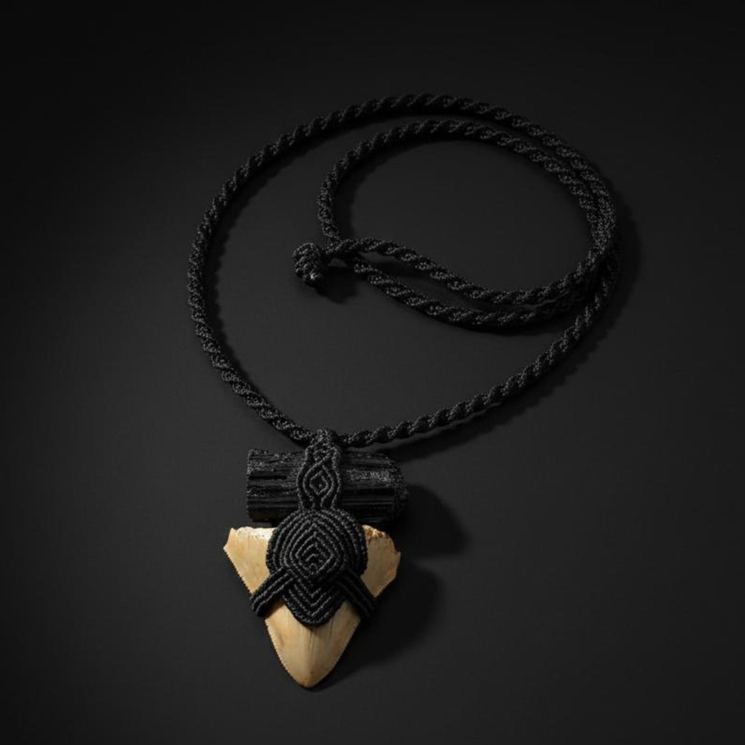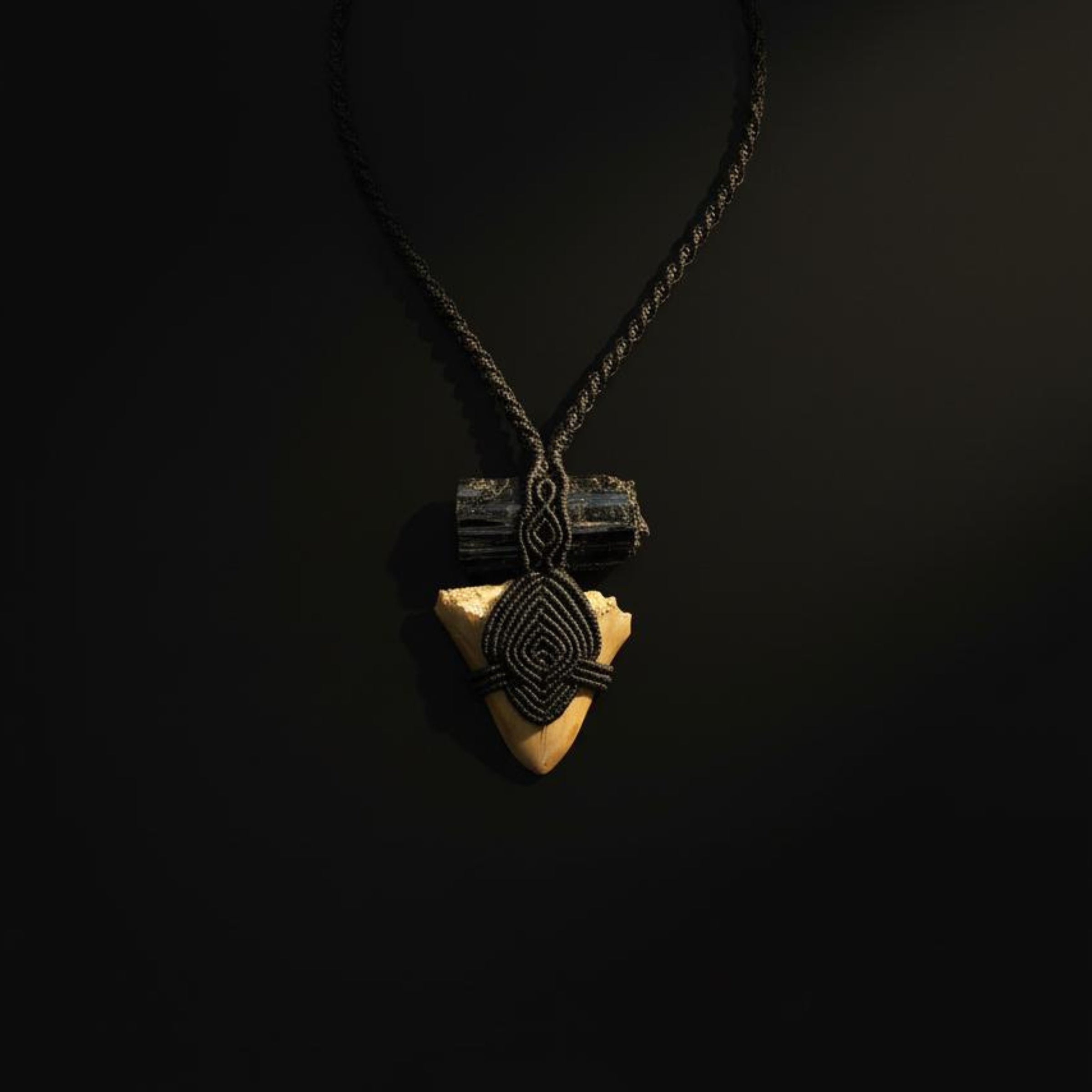 Collar de macramé y colgante diente de Megalodón con piedra Turmalina engastado.