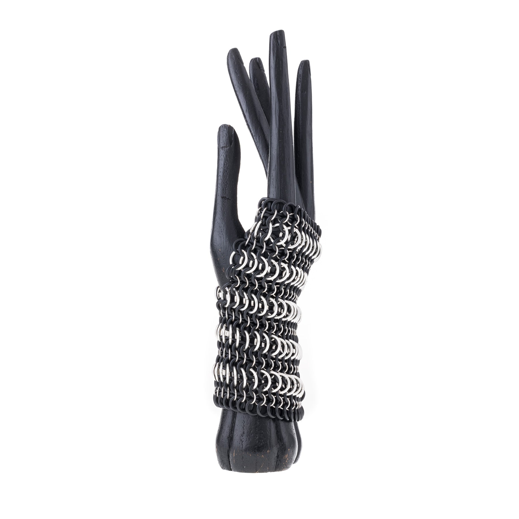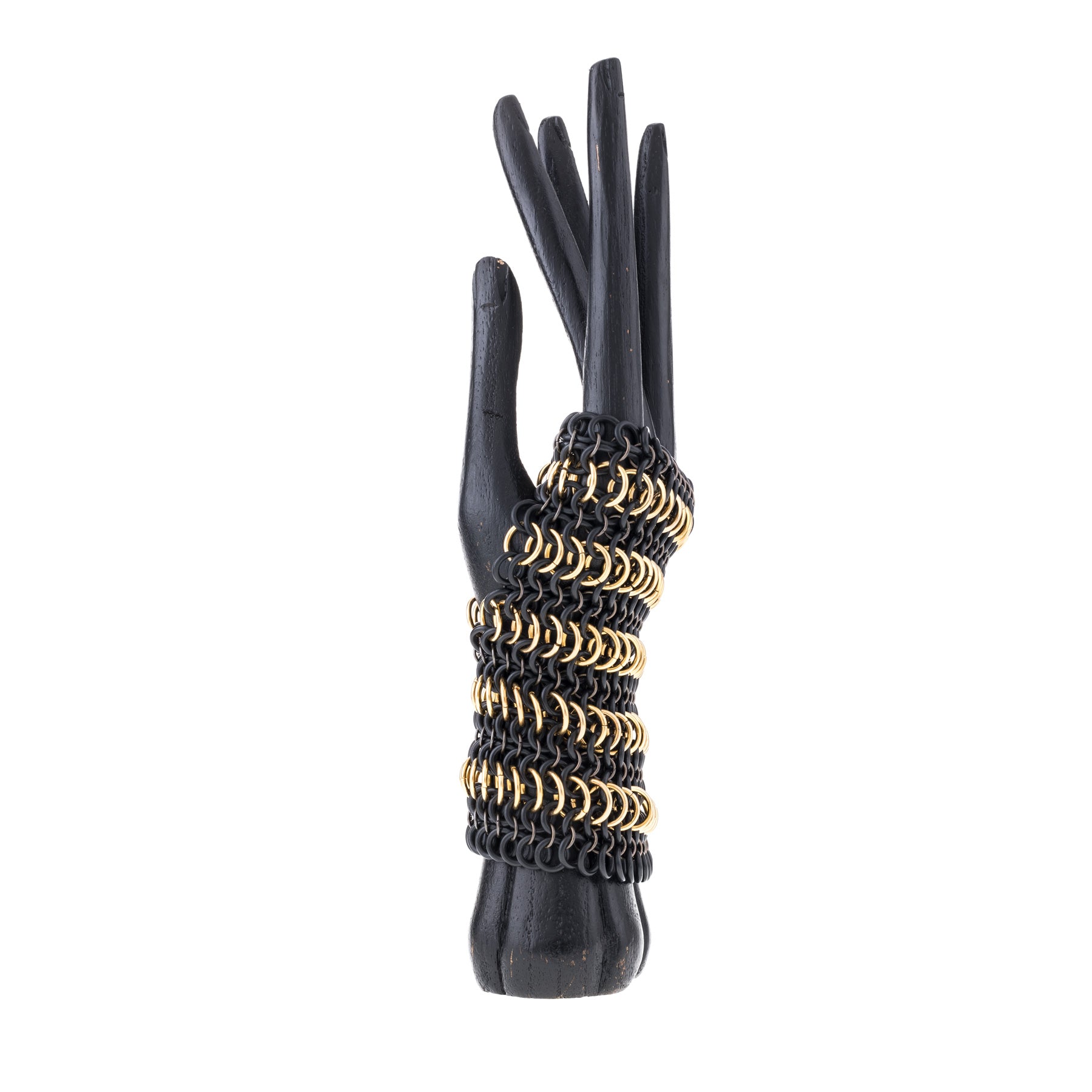 Guante de malla elástica, entrelazada a mano con anillas bañadas en oro o plata, combinadas con gomas de caucho.