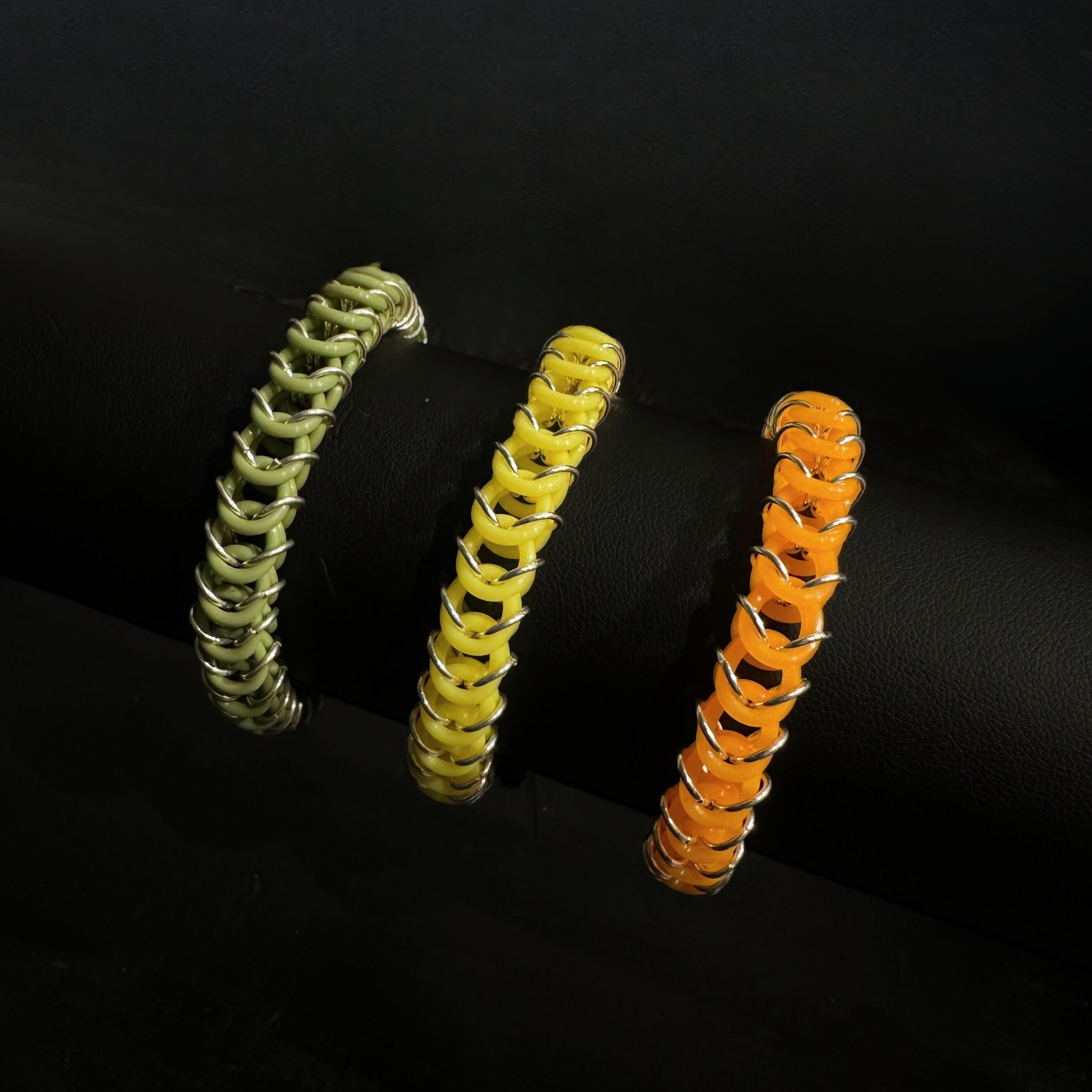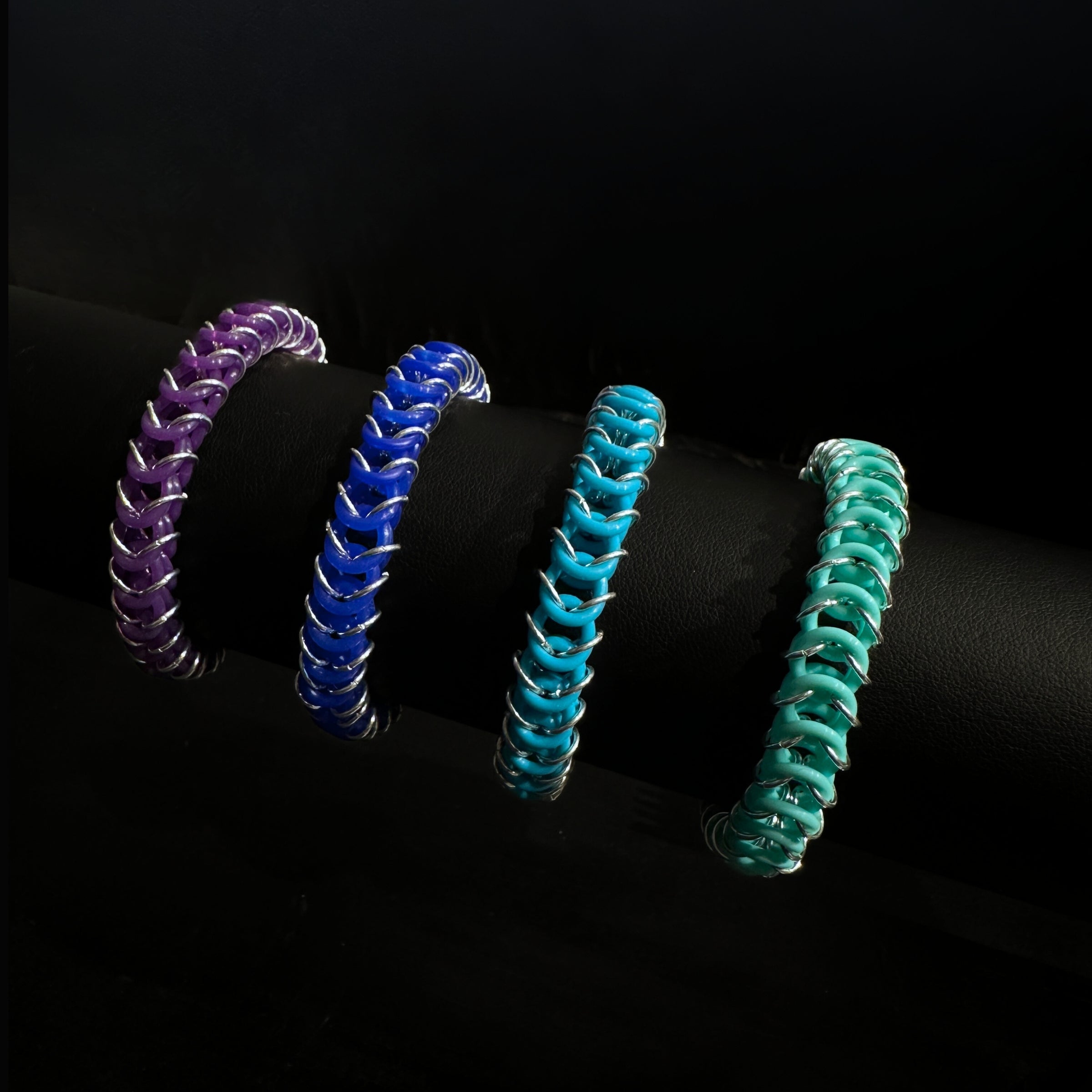 Pulsera de malla elástica, entrelazada a mano con anillas bañadas en oro o plata, combinadas con gomas de caucho.