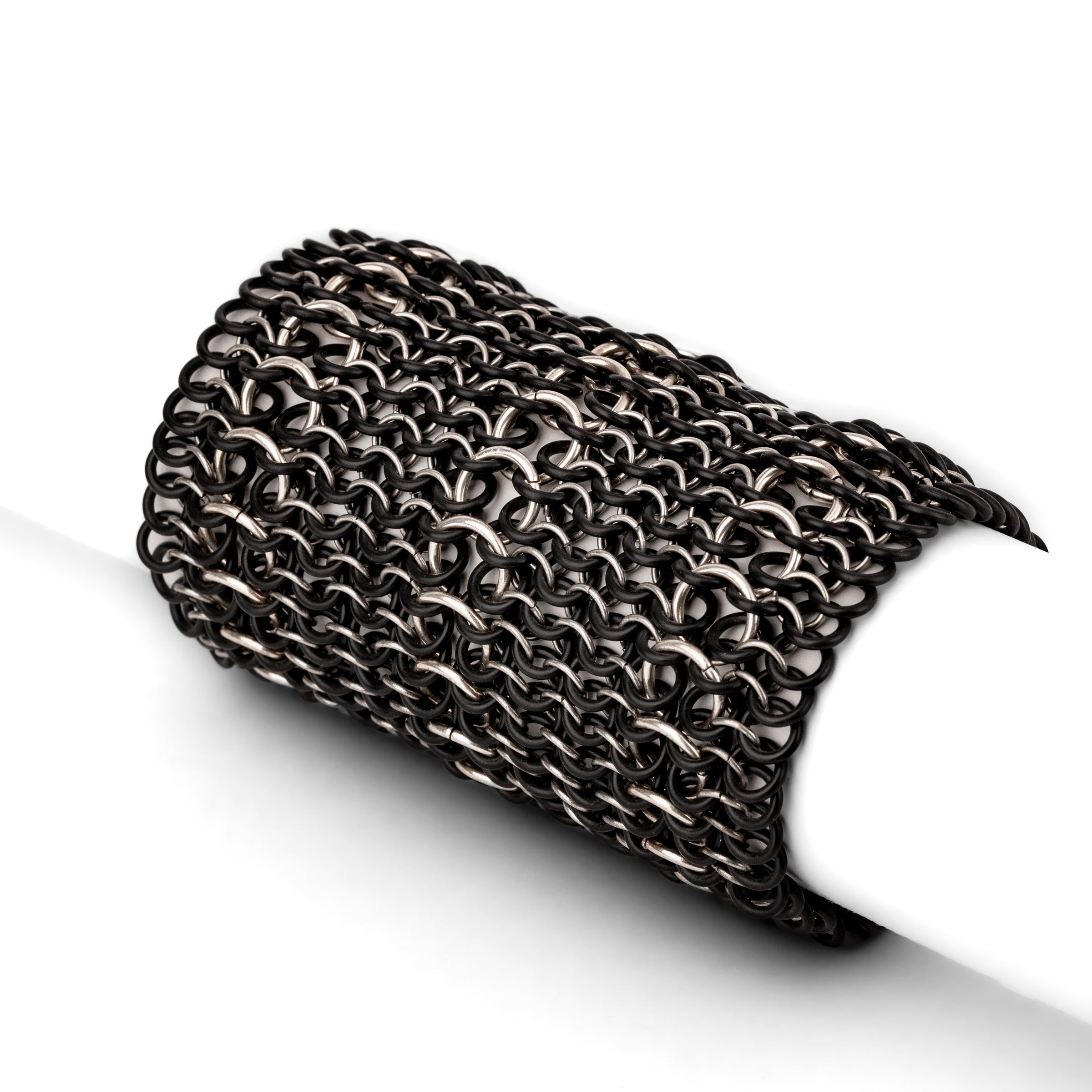 Pulsera de malla elástica, entrelazada a mano con anillas bañadas en oro o plata, combinadas con gomas de caucho.